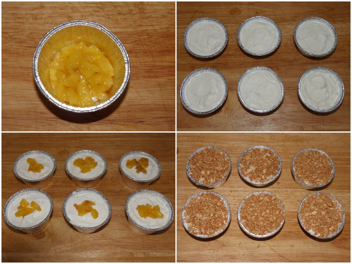 Distribuite 2/3 delle pesche sul fondo dei pirottini, bagnandole con qualche goccia di limone.