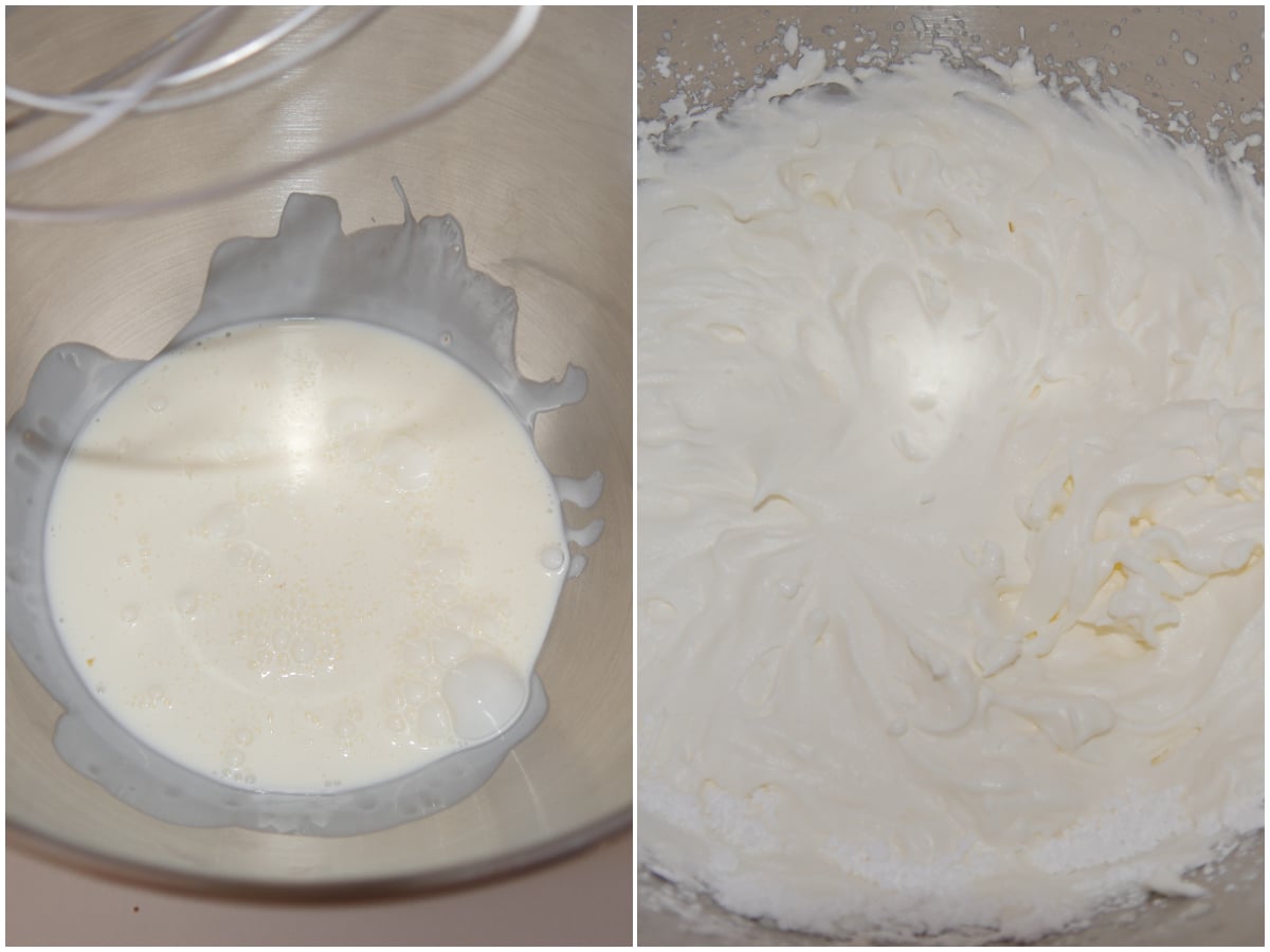 Montate la panna fredda di frigo e dividetela in 2 parti uguali.