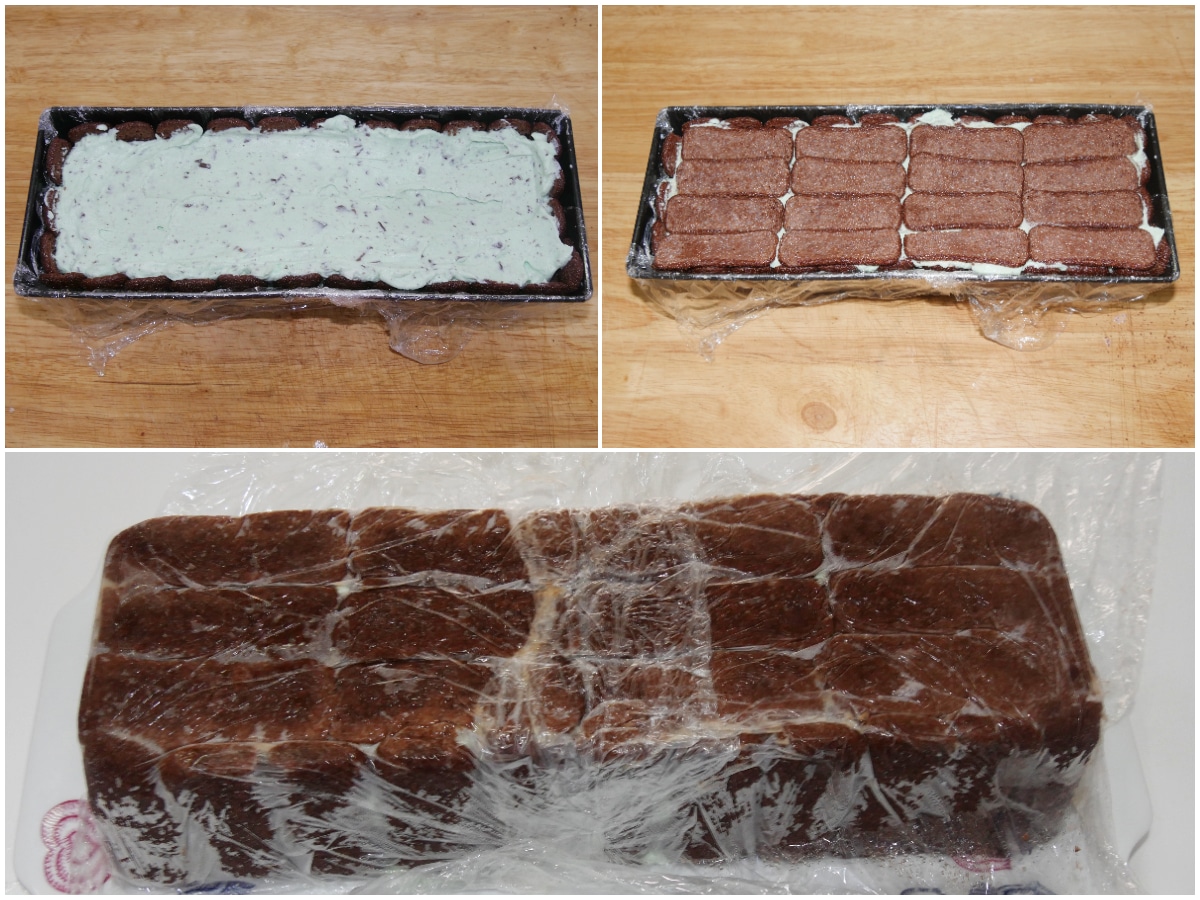 Versate la crema nello stampo, quindi coprite anche questa con i pavesini (sempre dopo averli bagnati appena nel latte).