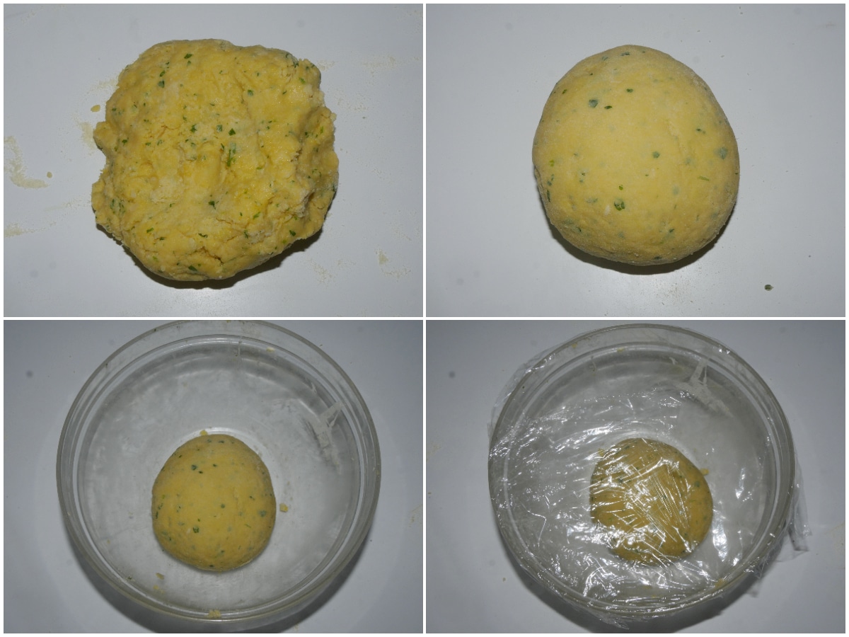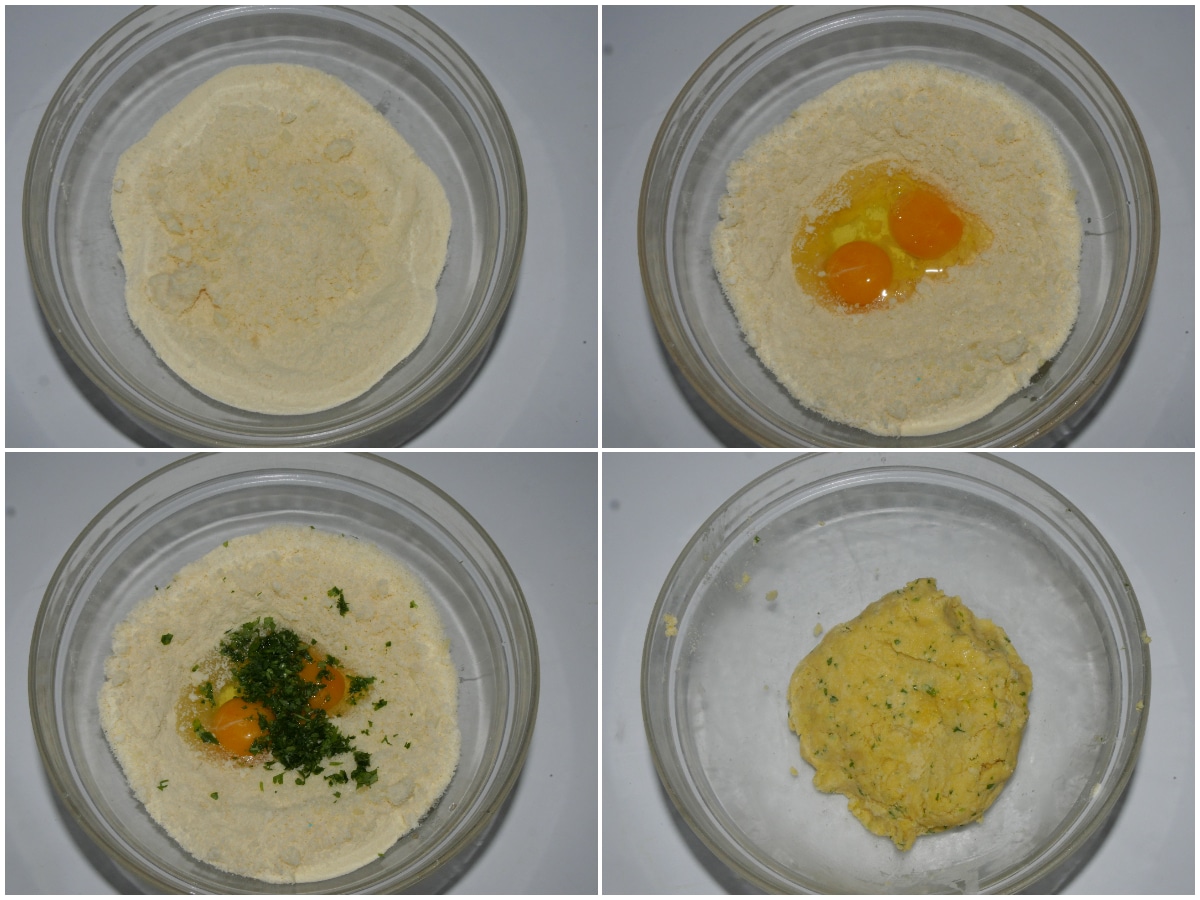 Innanzitutto preparate l'impasto: unite in una ciotola farina, uova, formaggio e prezzemolo tritato e impastate rapidamente fino a formare un panetto omogeneo (dovrebbe risultare un composto piuttosto asciutto).