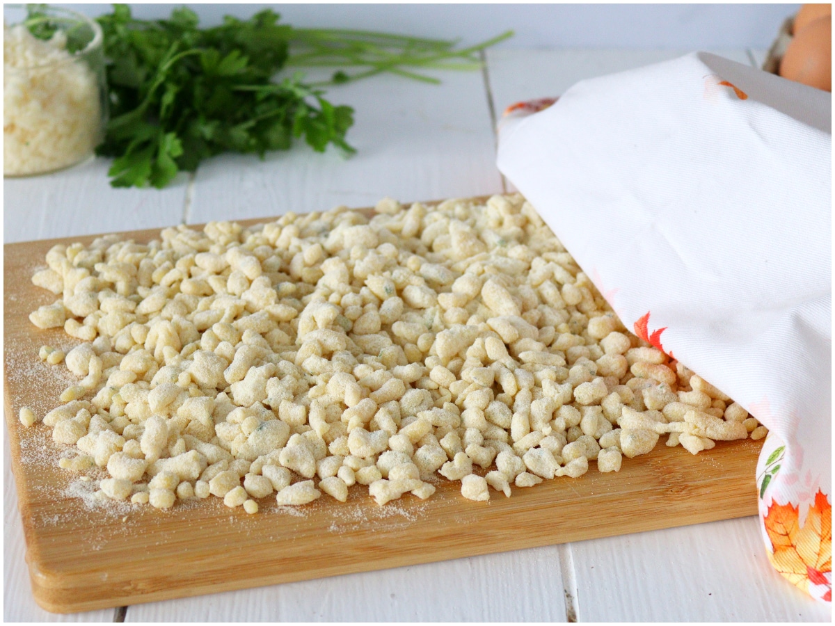 Riprendete il panetto, dividetelo in pezzi più piccoli, quindi prendete un pezzo per volta e sminuzzatela: potete farlo a mano, ricavando dei pezzettini irregolari con le dita, oppure con una mezzaluna, come se voleste tritarla (è da qui che prende il nome di semola battuta): man mano che è pronta mettetela su di un vassoio ben infarinato e lasciatela asciugare per almeno 1 ora.