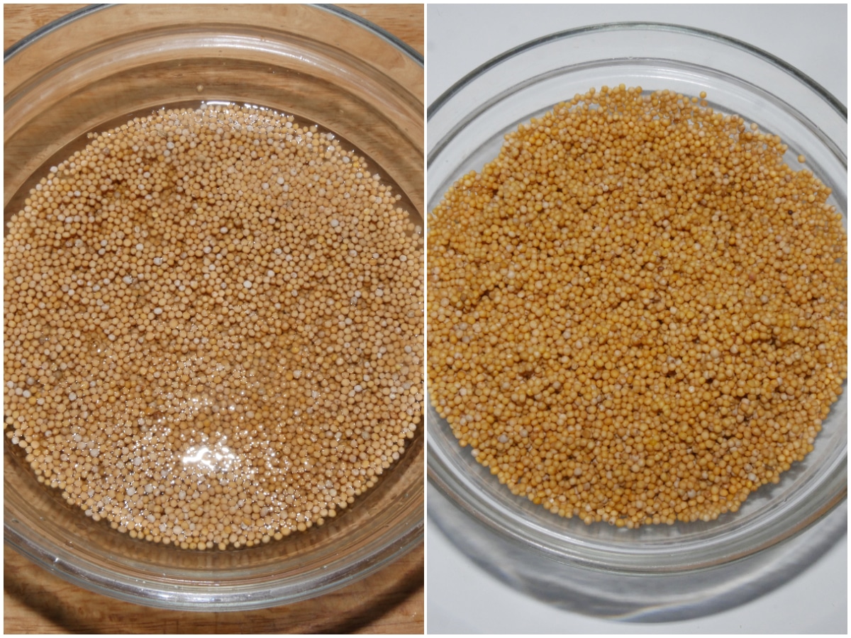 Innanzitutto mettete i grani di senape in una ciotola, copriteli con l'aceto e lasciateli riposare per circa 12 ore o fin quando non avranno assorbito tutto il liquido.