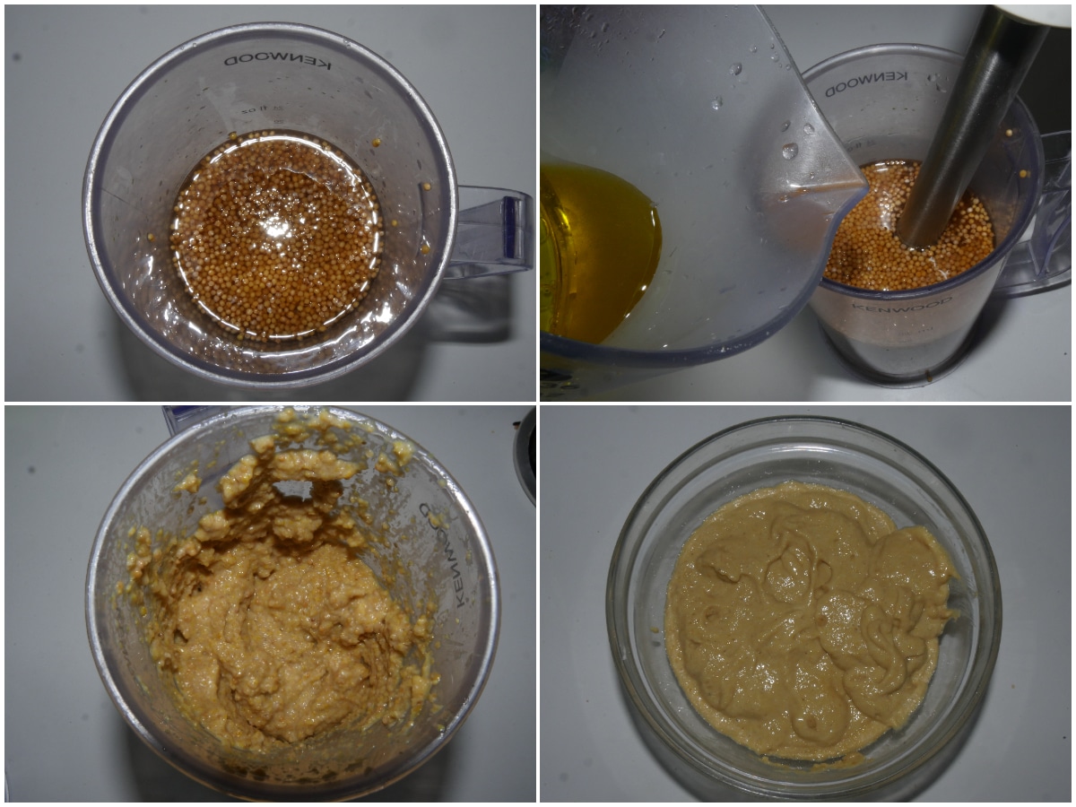 Passate le 12 ore sciogliete lo zucchero e un pizzico di sale nell'acqua, aggiungete i grani di senape e iniziate a frullare con un minipimer, aggiungendo man mano l'olio a filo, continuando fino ad ottenere un composto cremoso e omogeneo.