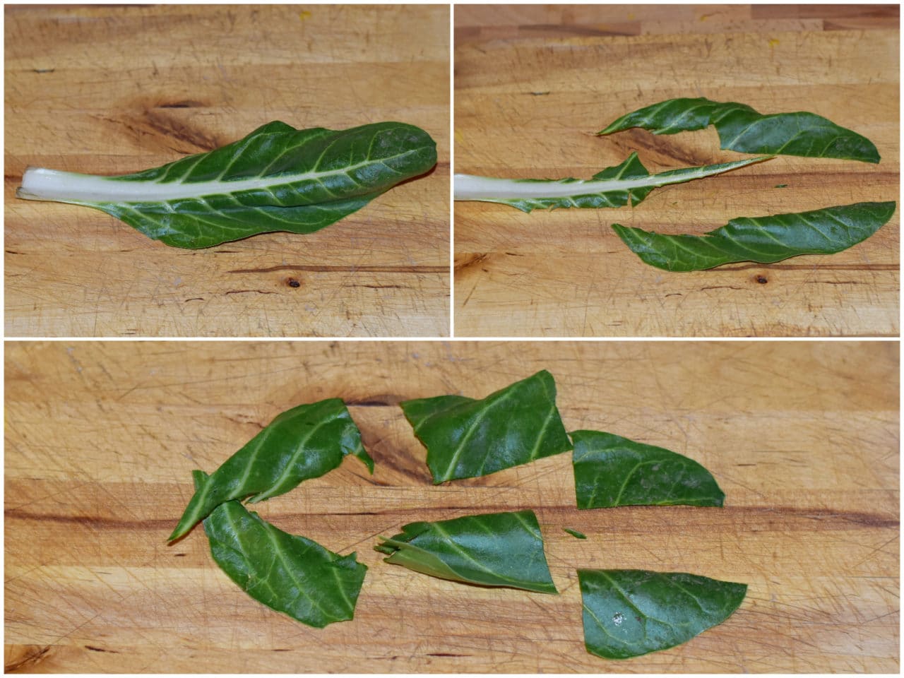 Lavate bene le bietole, mondatele eliminando le coste dure e tagliate le foglie e pezzi.