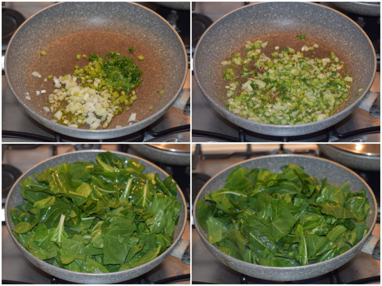 Fate appassire il trito di odori in un'ampia padella antiaderente con olio, quindi unite le biete e lasciate cuocere per circa 10 minuti.