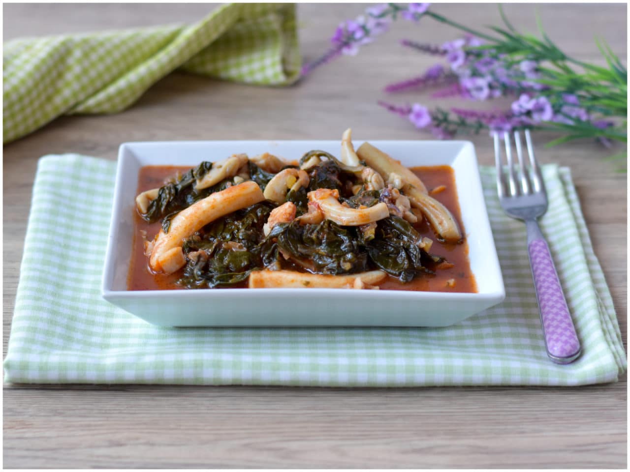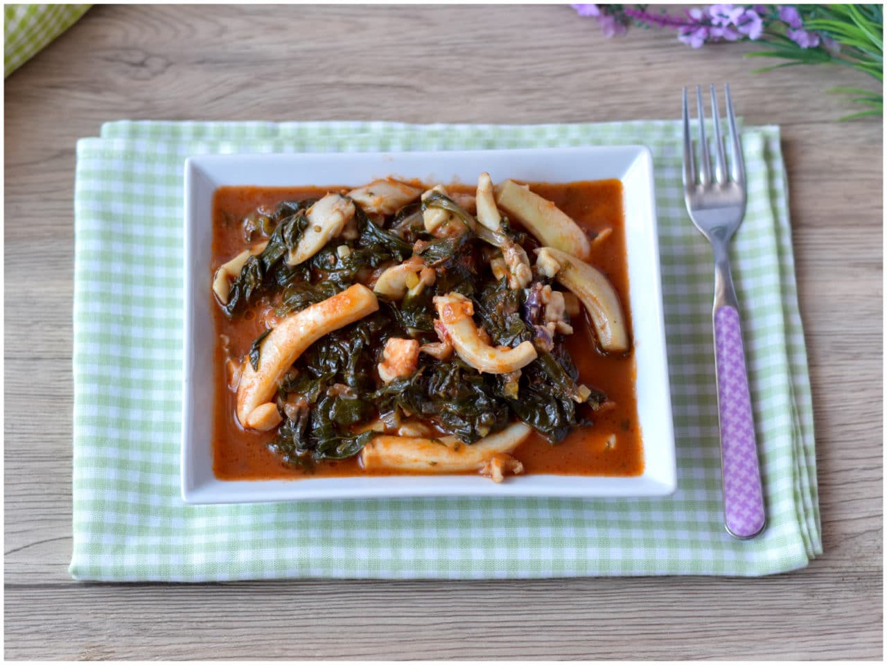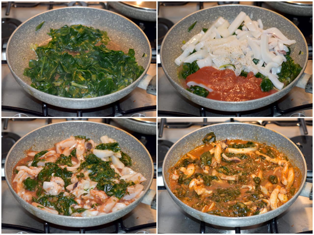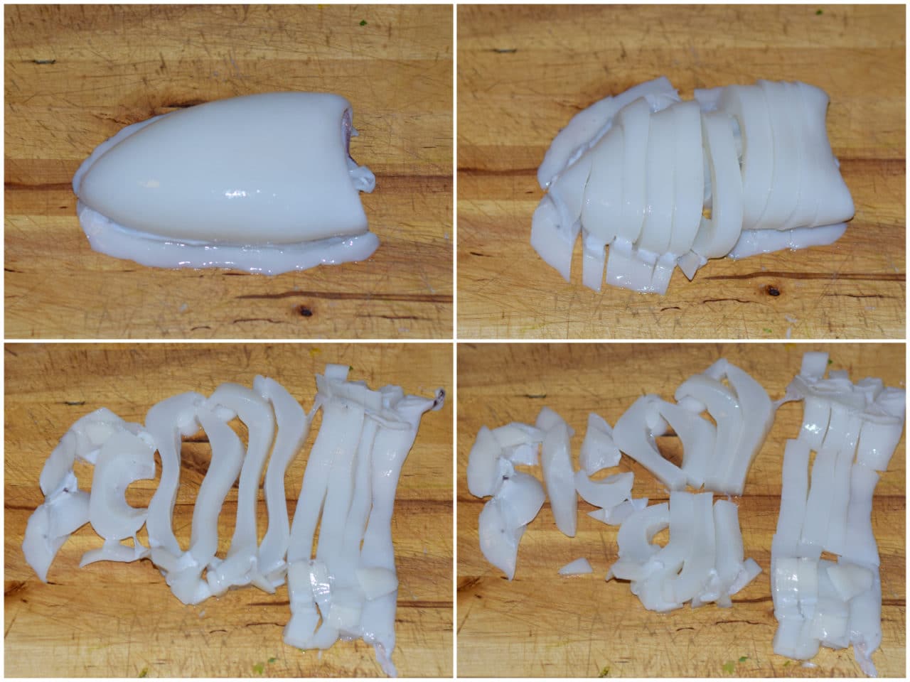 Se non le avete comprate già pulite mondate anche le seppie (qui la guida per farlo al meglio), quindi lavatele e tagliatele a listarelle.