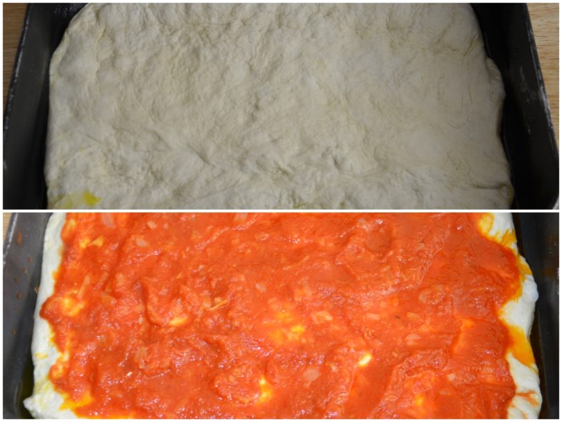 Una volta cresciuto, riprendete l'impasto, sgonfiatelo e stendetelo in una teglia unta d'olio, quindi condite con la salsa.
