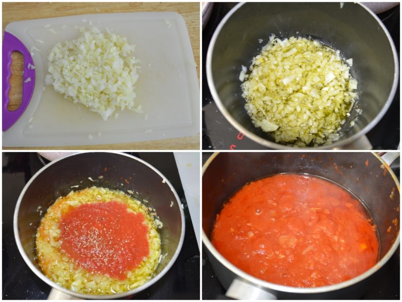 Nel frattempo preparate il condimento: tritale la cipolla, soffriggetela in un paio di cucchiai di olio, aggiungete i pomodori tritati, mezzo bicchiere d'acqua, un pizzico di zucchero, sale, pepe e origano e fate cuocere per almeno 30 minuti a fuoco basso, quindi lasciate raffreddare.
