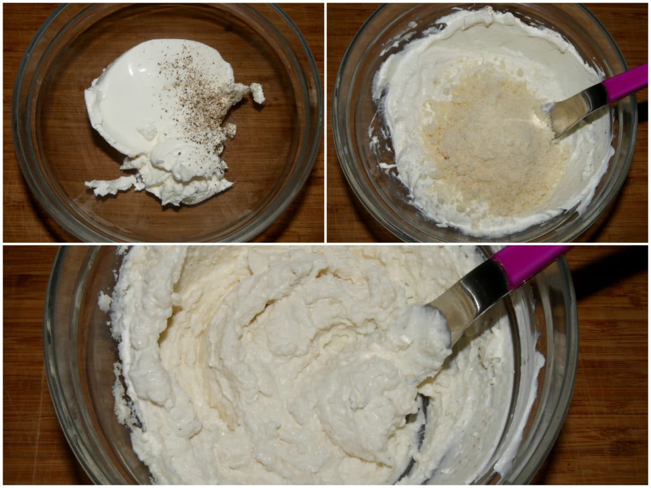 Versate la ricotta in una ciotola con sale e pepe. Unite poi, il parmigiano reggiano grattugiato e amalgamate fino a rendere la ricotta, una crema