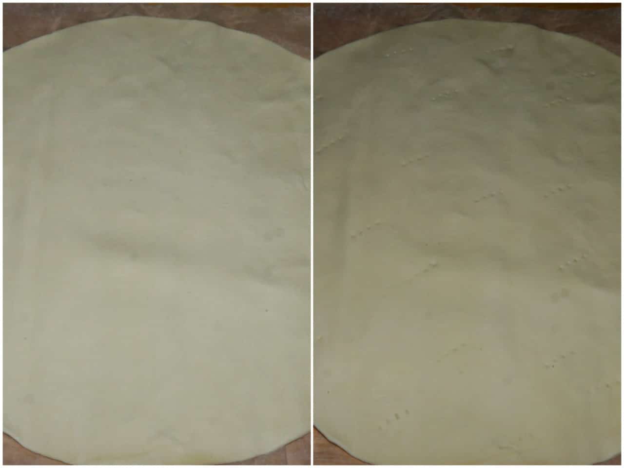 Srotolate la pasta sfoglia, e bucherellate la base con i rebbi di una forchetta.