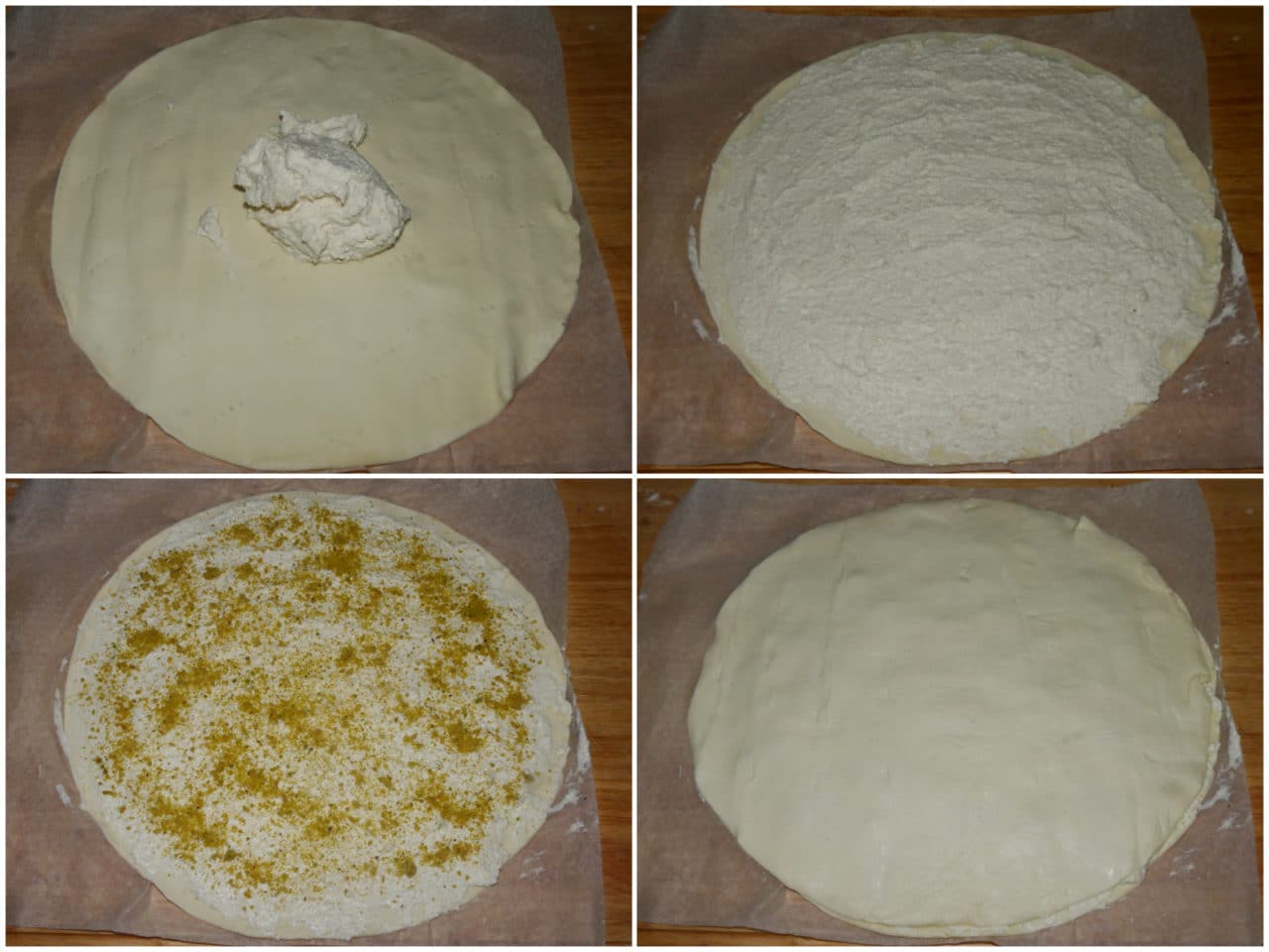 Farcite la prima sfoglia con la crema du ricotta e la granella di pistacchio e chiudete con la seconda, sigillando bene i bordi.
