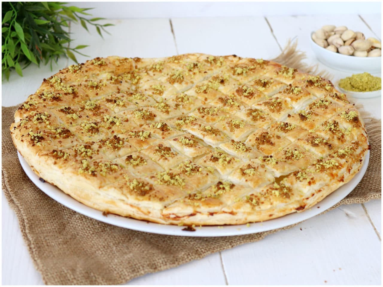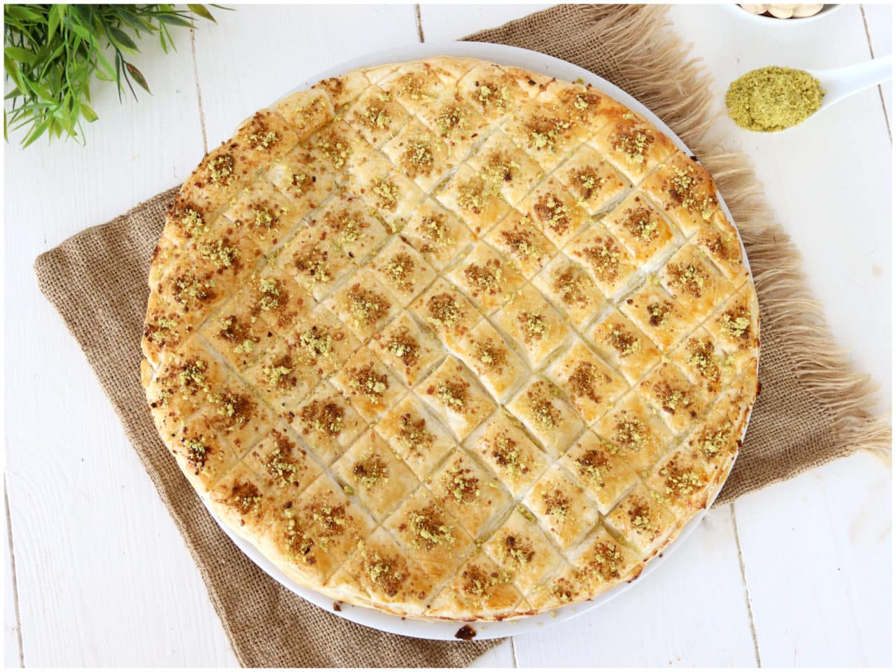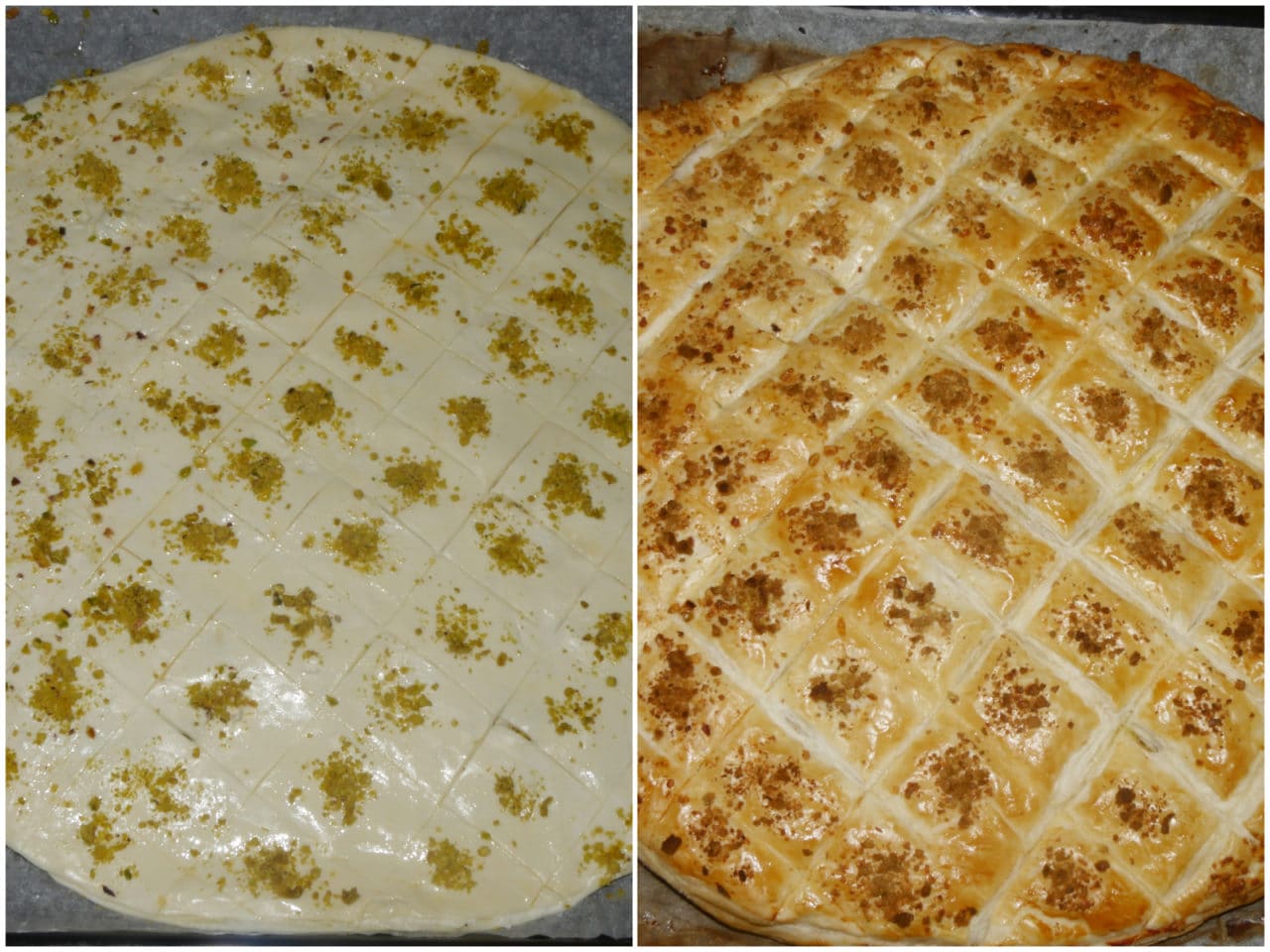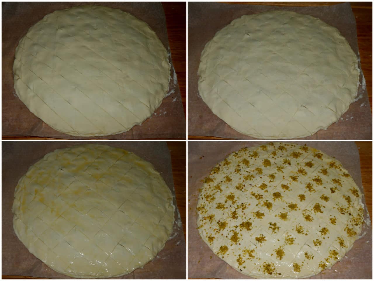 Spennellate la superficie con un tuorlo sbattuto e finite decorate ogni quadratino con la granella di pistacchi. Cuocete la sfoglia a 200° in forno ventilato già caldo per circa 25 minuti.