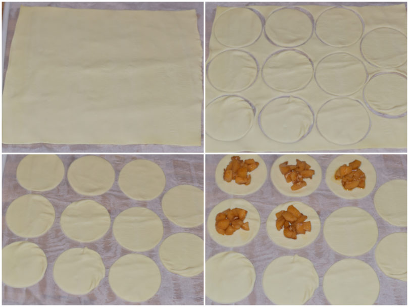 Srotolate la pasta sfoglia e create tanti cerchietti con un coppapasta da circa 8 cm di diametro (recuperate i ritagli di sfoglia, impastateli velocemente tra di loro, stendeteli in una sfoglia e riutilizzateli per ricavare altri cerchi).