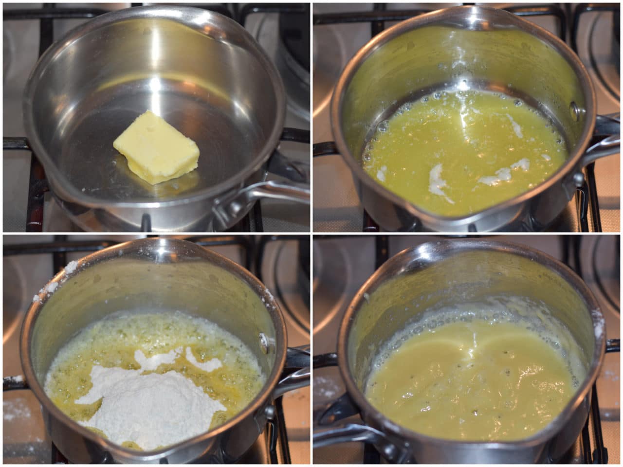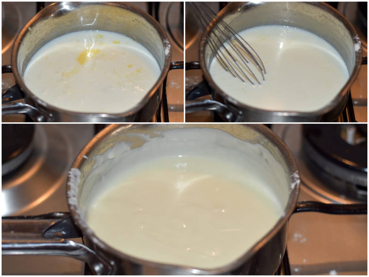 Passate poi alla besciamella: scaldate il latte fin quasi a raggiungere il bollore; a parte, lasciate sciogliere il burro in una casseruola a fiamma bassa, incorporateci dentro la farina tutta in una volta e mescolate subito; lasciate cuocere per 4-5 minuti, mescolando costantemente, quindi togliete dal fuoco e incorporate il latte caldo a filo, continuando a mescolare, infine rimettete sul fuoco e lasciate addensare, sempre a fiamma bassa e sempre mescolando.