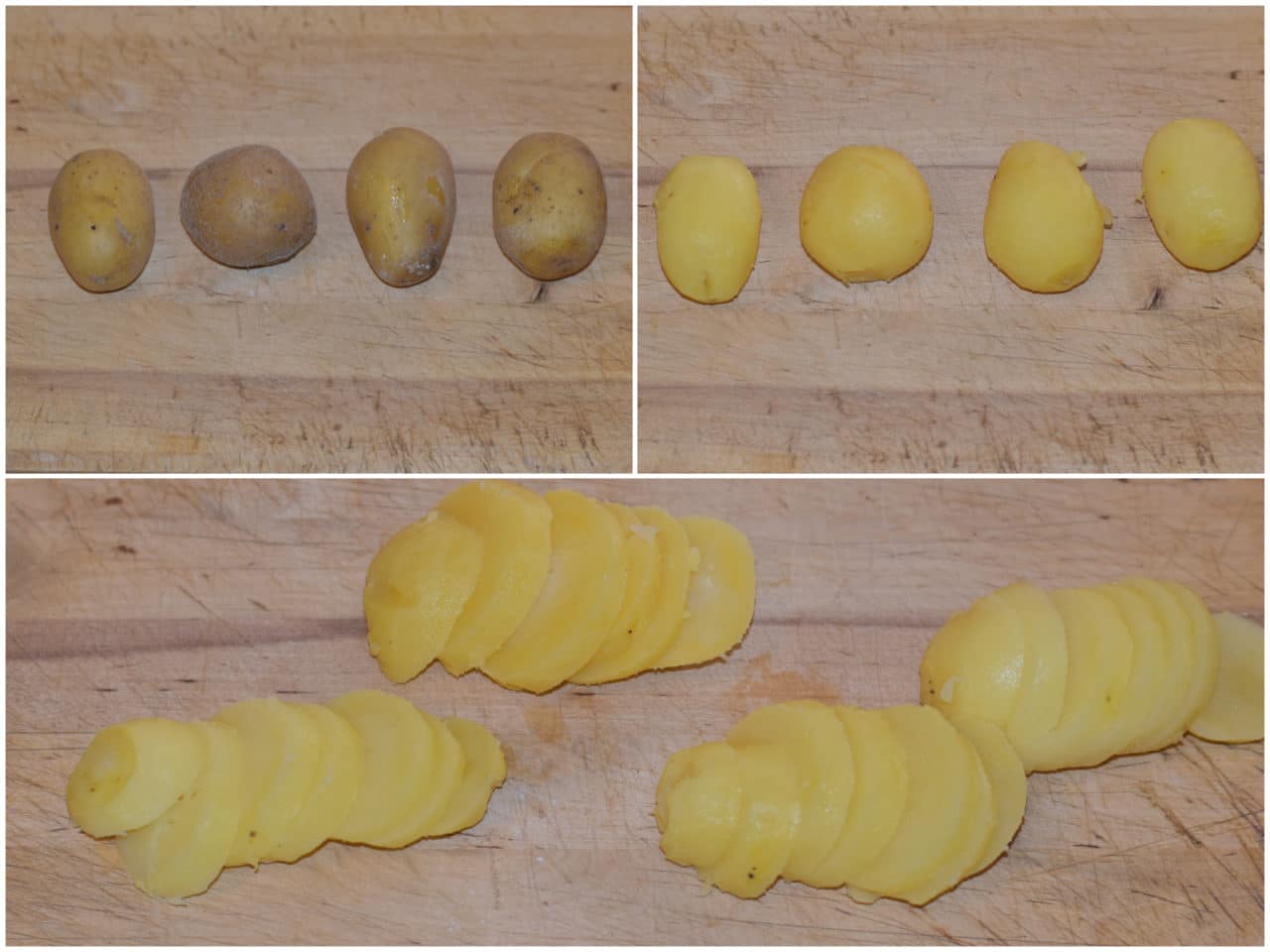 Quando le patate saranno ben cotte scolatele e pelatele, poi lasciatele almeno intiepidire prima di tagliarle a fette spesse circa 0,5-1 cm.