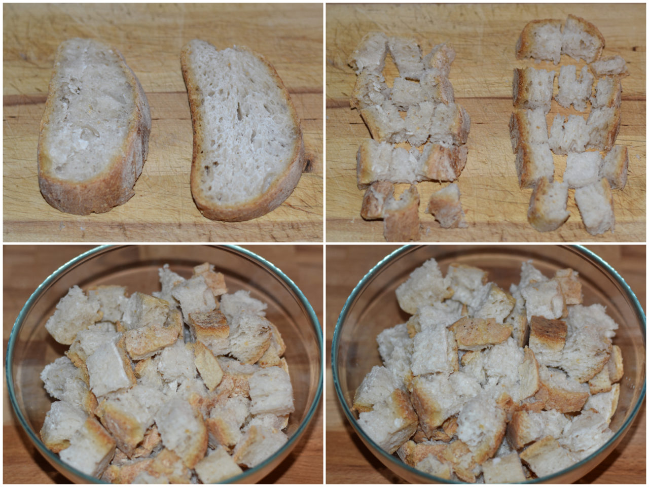 Innanzitutto tagliate il pane a cubetti e mettetelo in una ciotola, quindi irroratelo con 150 ml di latte, facendo attenzione a bagnarlo tutto, e lasciatelo riposare per almeno 30 minuti.