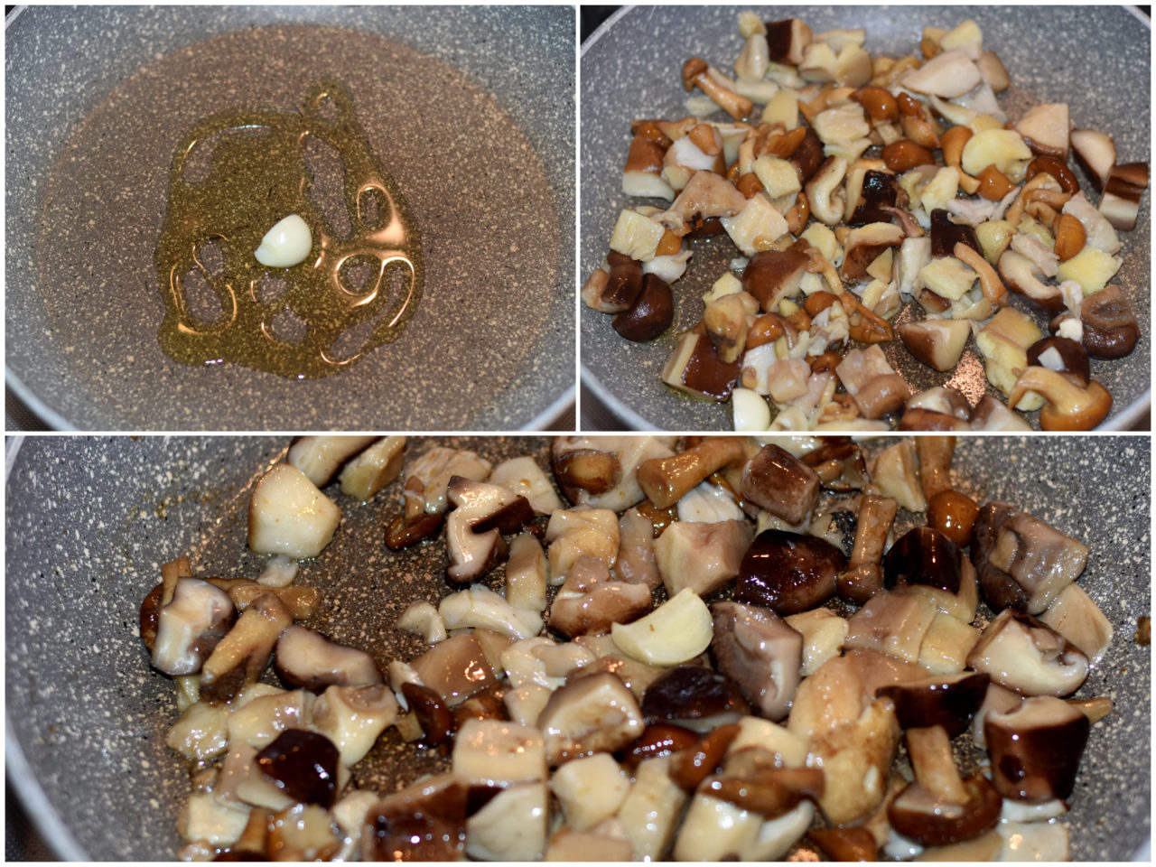 Fate scaldare dell'olio in una padella antiaderente con l'aglio, quindi unite i funghi (già scongelati, se avete usato il misto surgelato) e lasciateli cuocere per circa 10 minuti, mescolando ogni tanto.