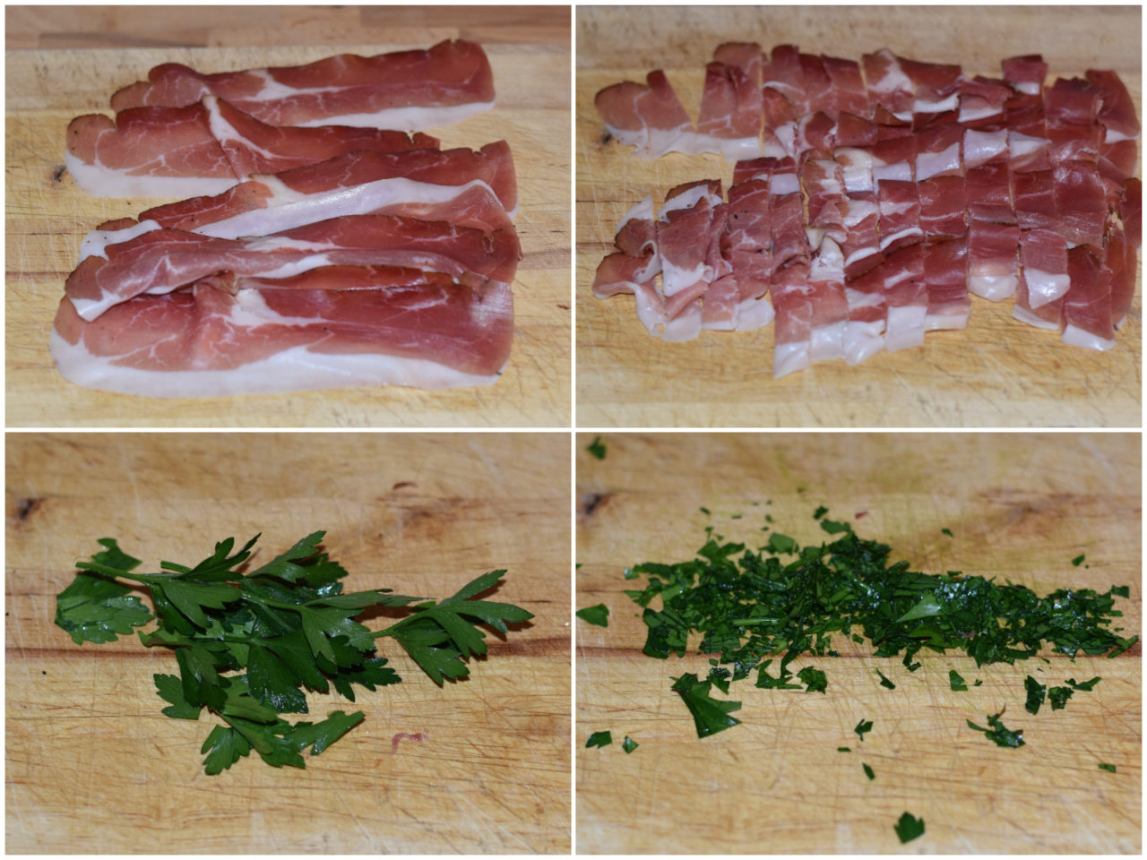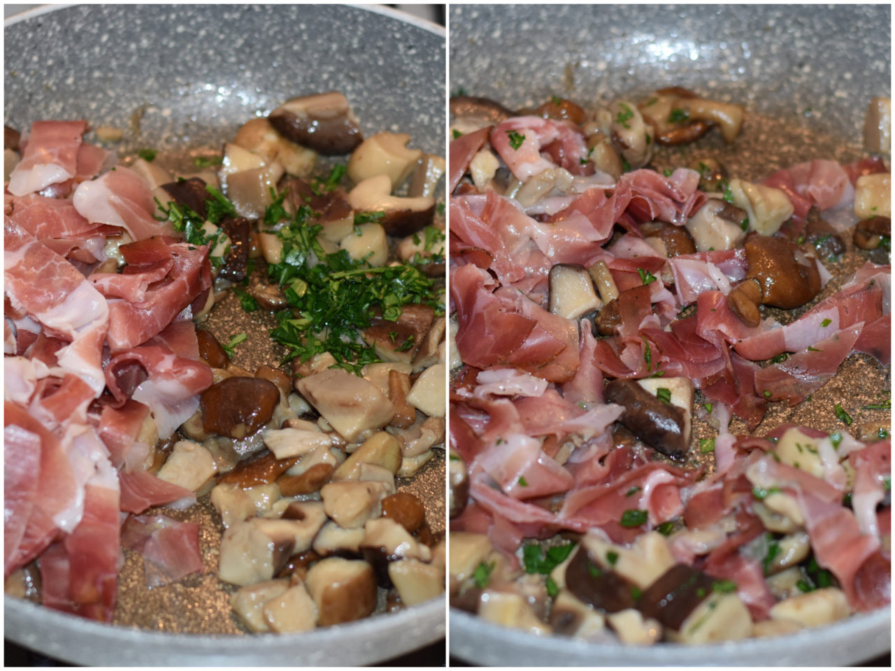 Nel frattempo tagliate lo speck a striscioline o quadratini e tritate il prezzemolo, quindi uniteli ai funghi e lasciate insaporire.
