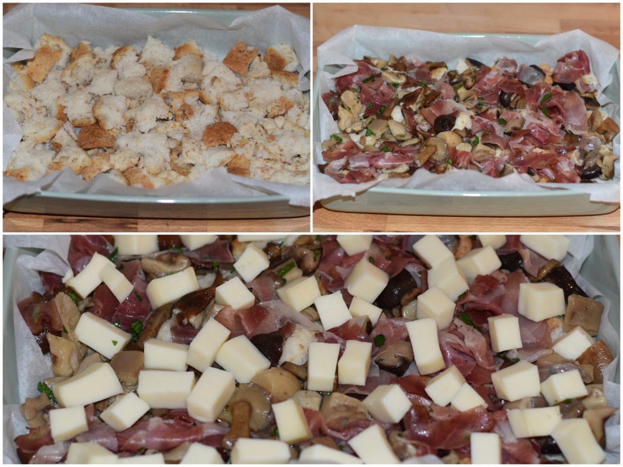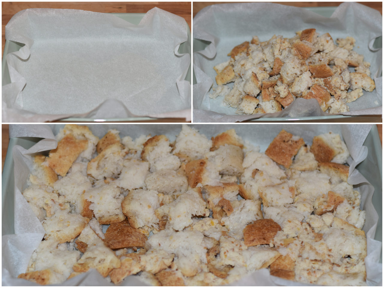Riprendete il pane e mettetelo in una pirofila rivestita di carta forno, cercando di creare uno strato uniforme (aiutatevi schiacciandolo un po' con il dorso di un cucchiaio, se serve).