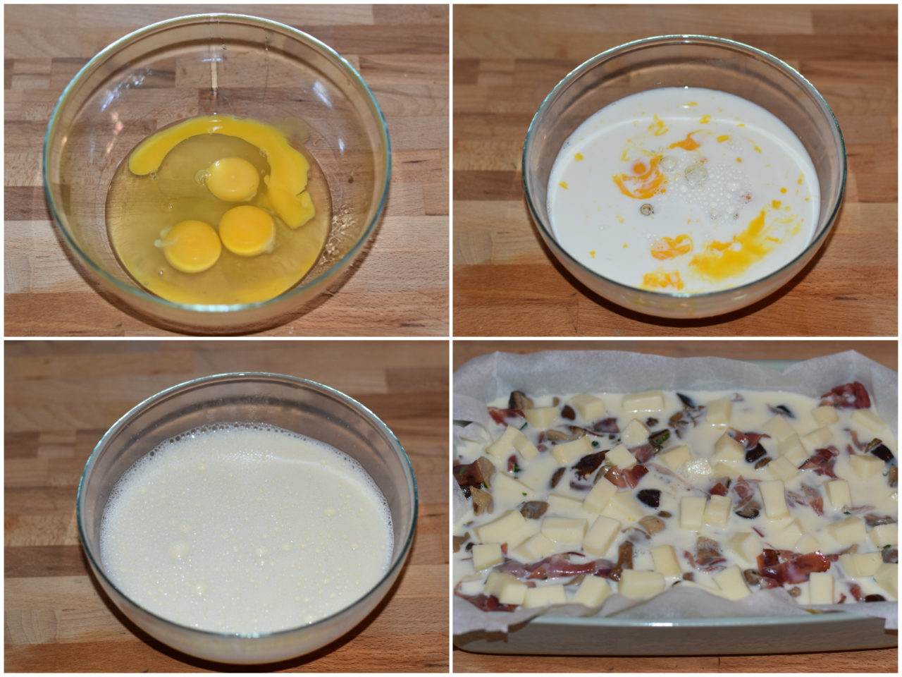 Sbattete le uova con il latte restante (500 ml) e un pizzico di sale e versatelo sopra agli ingredienti nella pirofila.