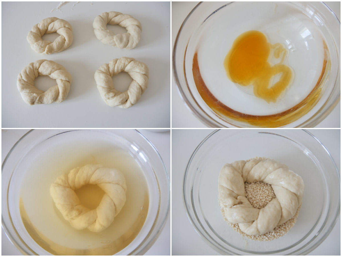 Sciogliete il miele nell'acqua, quindi intingeteci completamente le ciambelline, una per volta, passandole poi nei semi di sesamo,
