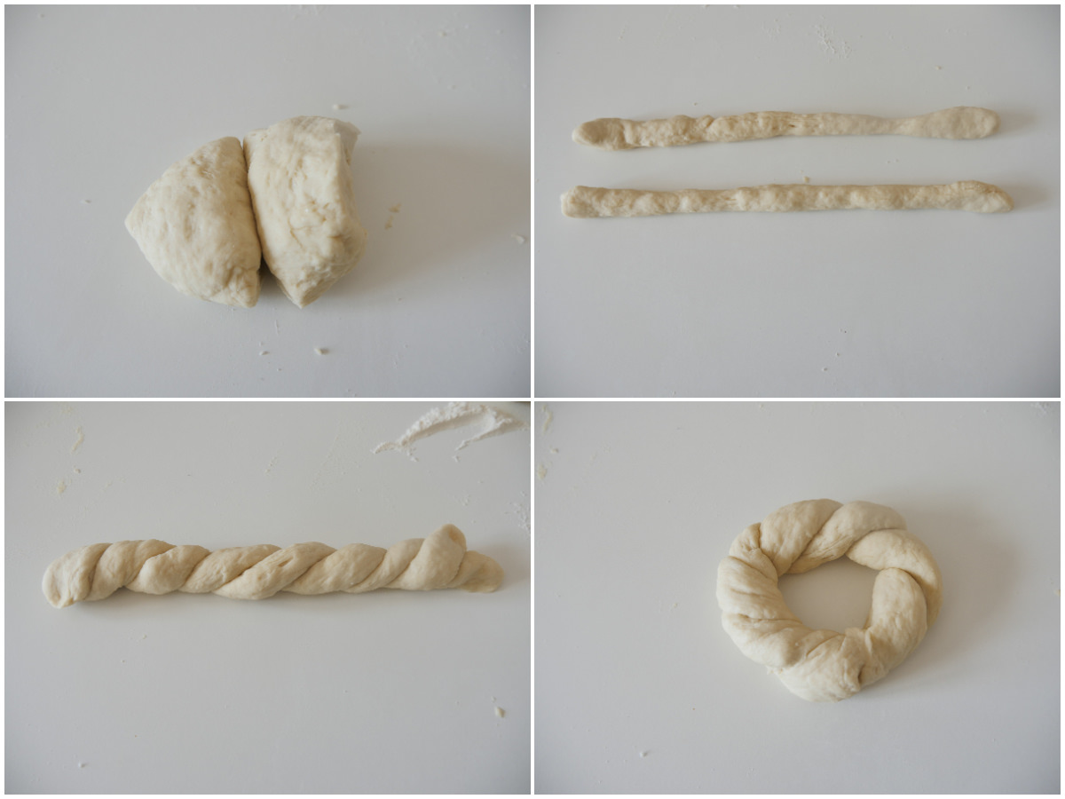 Dividete ogni pezzo a metà, allungate ogni metà a formare un cordoncino, intrecciateli tra loro e quindi chiudeteli a cerchio, sigillando le estremità tra di loro, per formare le ciambelle.