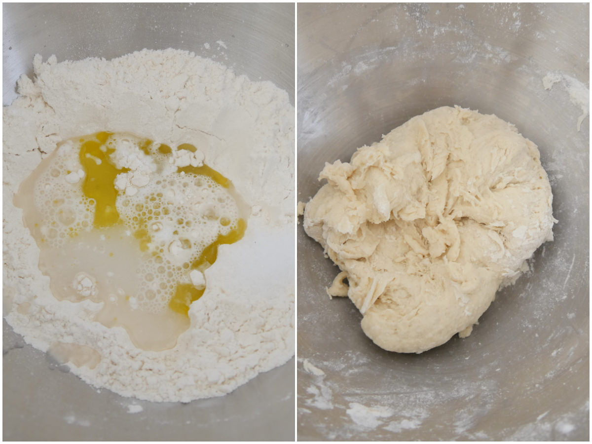 Mettete in una ciotola farina, zucchero, sale, lievito, olio e acqua e impastate fino ad ottenere un panetto omogeneo, spennellate con olio e fate riposare a temperatura ambiente per 20-30 minuti.