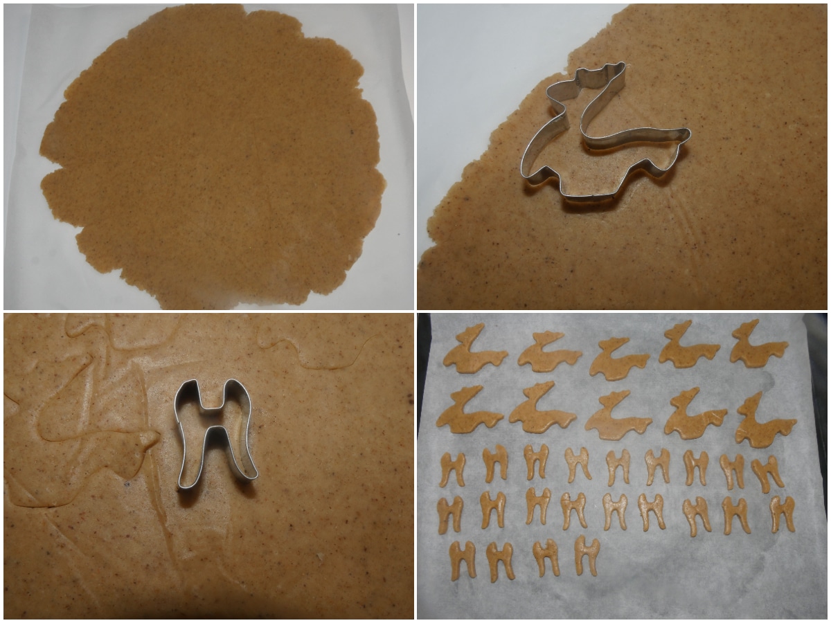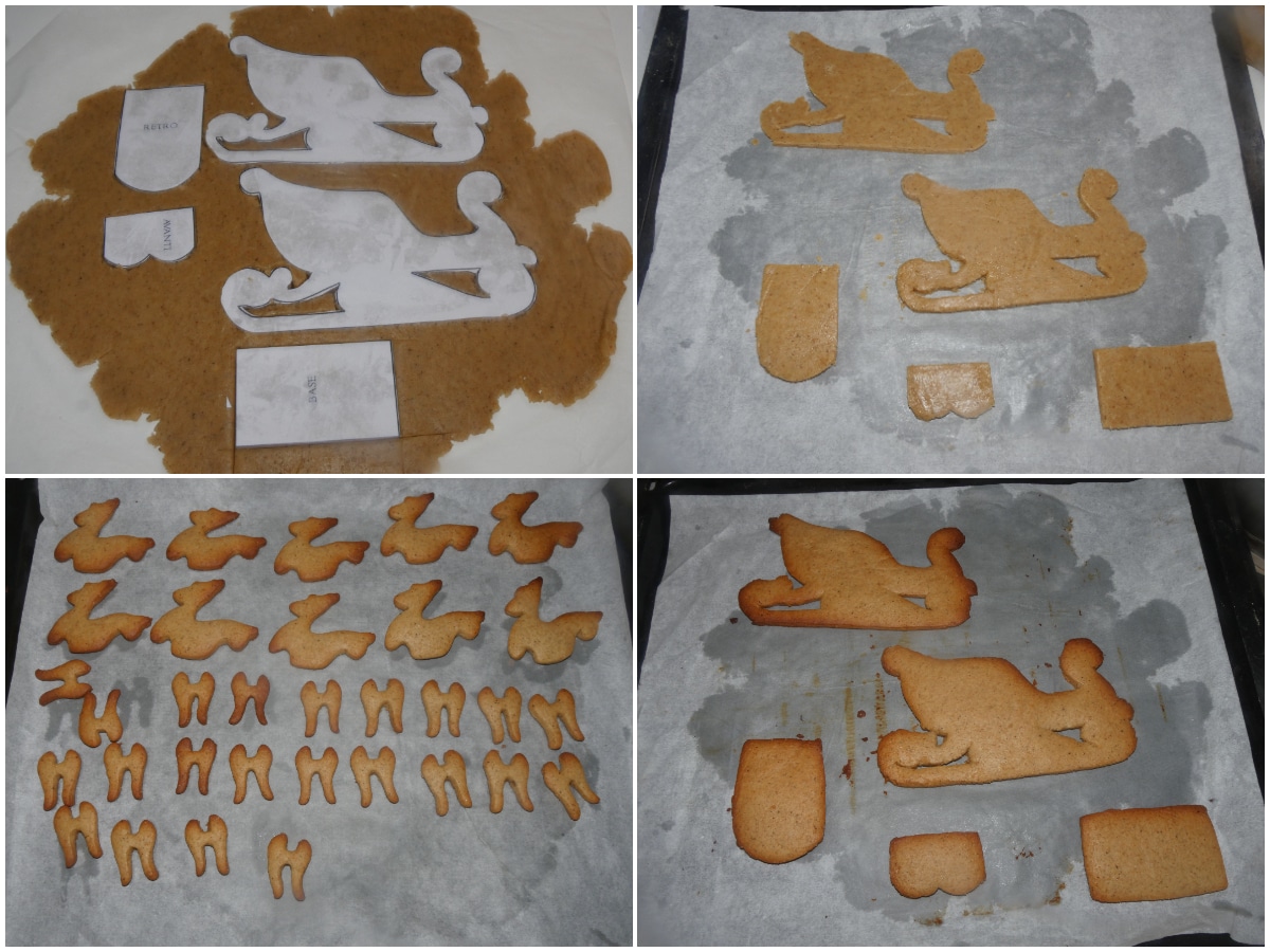 Stendete la frolla in una sfoglia non troppo sottile (circa 5 mm) e ricavate i biscotti: le renne con gli stampini e i pezzi della slitta ritagliando con un coltello a lama liscia le sagome ricavate dal modello stampabile.