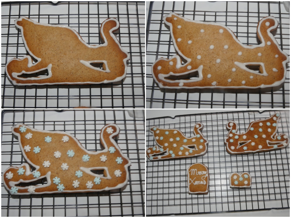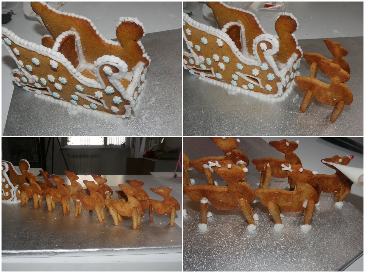 Una volta completata la slitta potete assemblare (io per sicurezza ho incollato anche le zampe delle renne con un pochino di glassa), posizionare e decorare anche le renne sul vassoio.