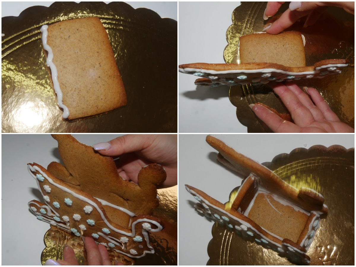 Usando la glassa come se fosse un collante, assemblate la slitta, unendo i 4 pezzi tra di loro.