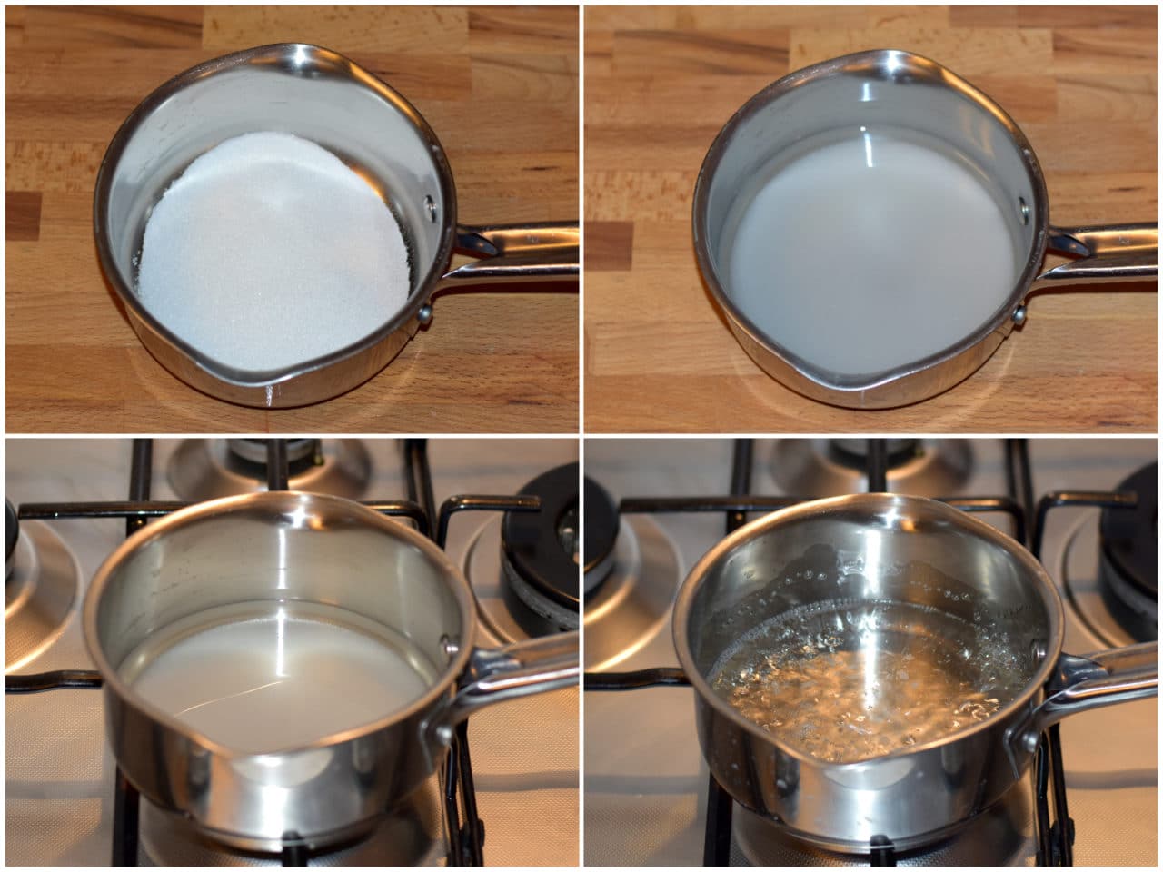 Unite in un pentolino acqua e zucchero e lasciate sciogliere a fiamma dolce, spegnendo non appena raggiunge l'ebollizione.
