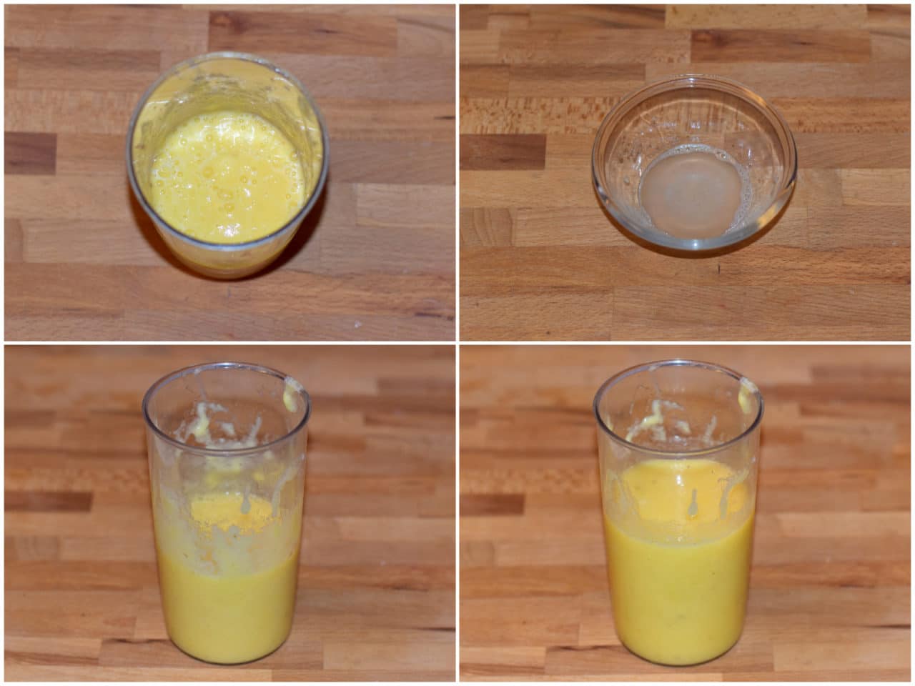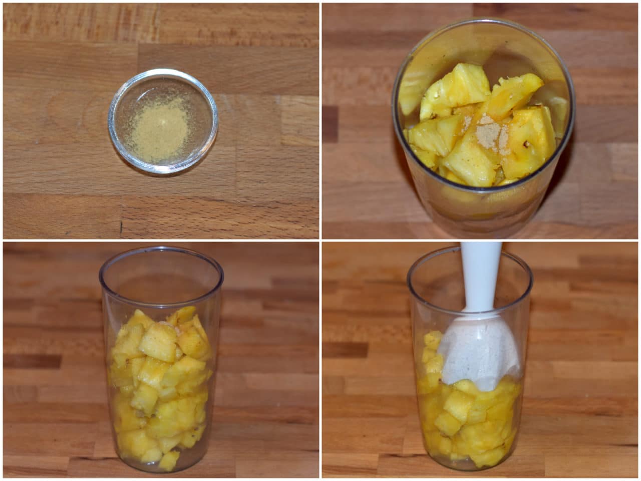 Unite ananas e zenzero in un contenitore e iniziate a frullare con un minipimer (in alternativa potete usare anche un mixer), aggiungete anche il succo di limone e lo sciroppo e continuate a frullare fino ad ottenere un composto molto liscio.