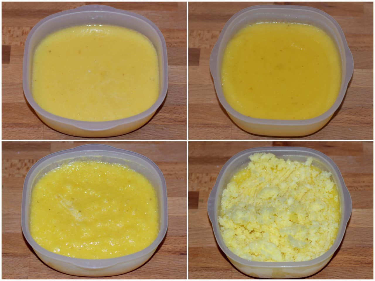 Trasferite il composto in un contenitore basso e largo e lasciate riposare in freezer: ogni 2-3 ore tiratelo fuori e rompete i cristalli di ghiaccio (potete usare i rebbi di una forchetta).