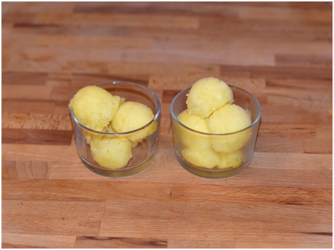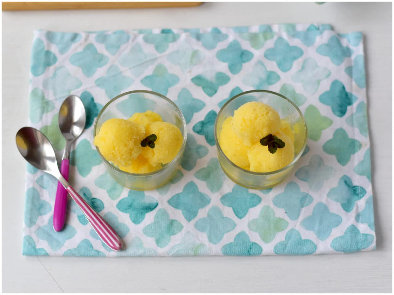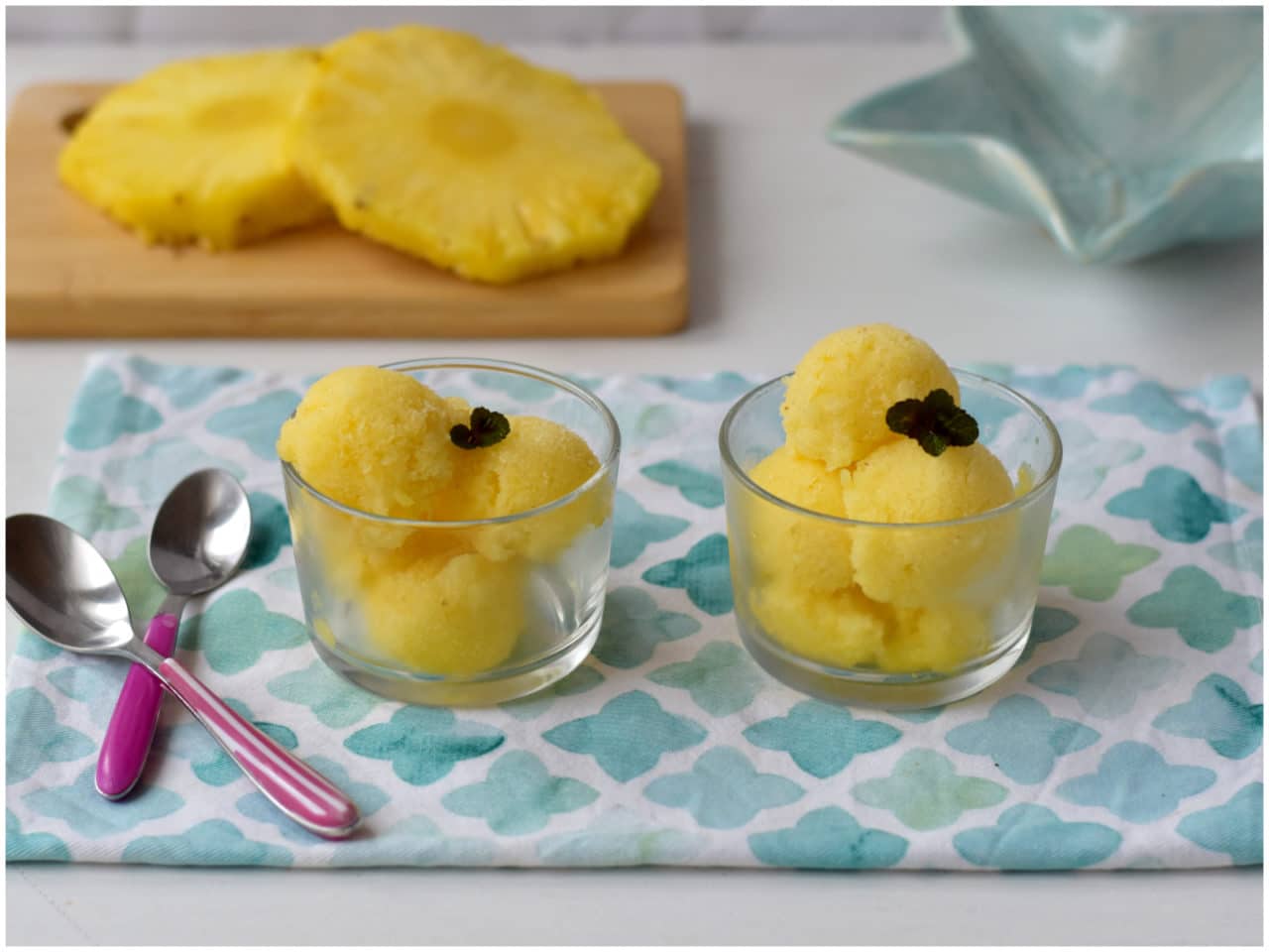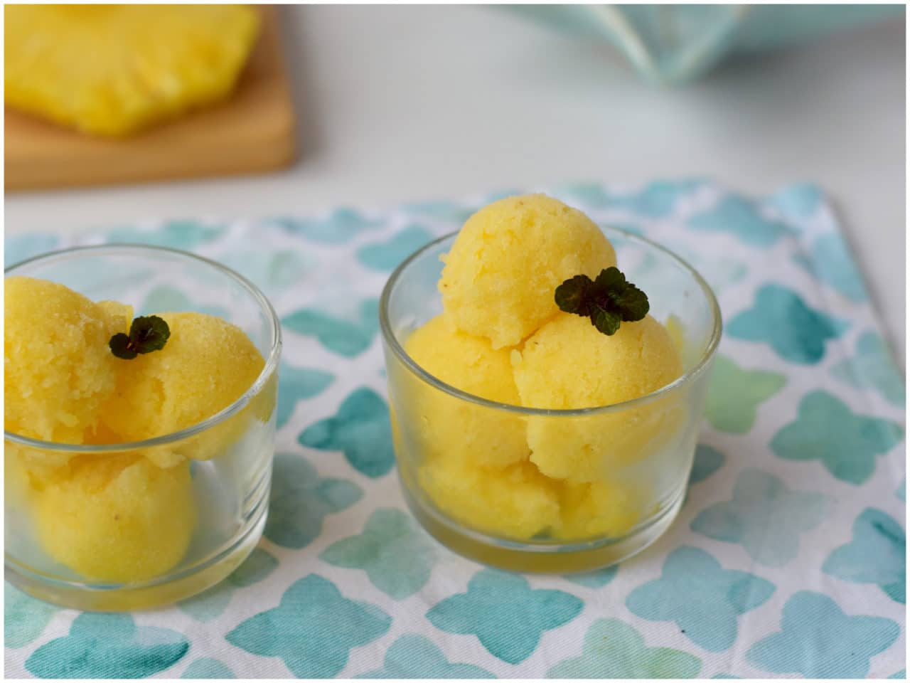 Il sorbetto all'ananas è pronto, non vi resta che decorarlo con qualche fogliolina di menta e servirlo.