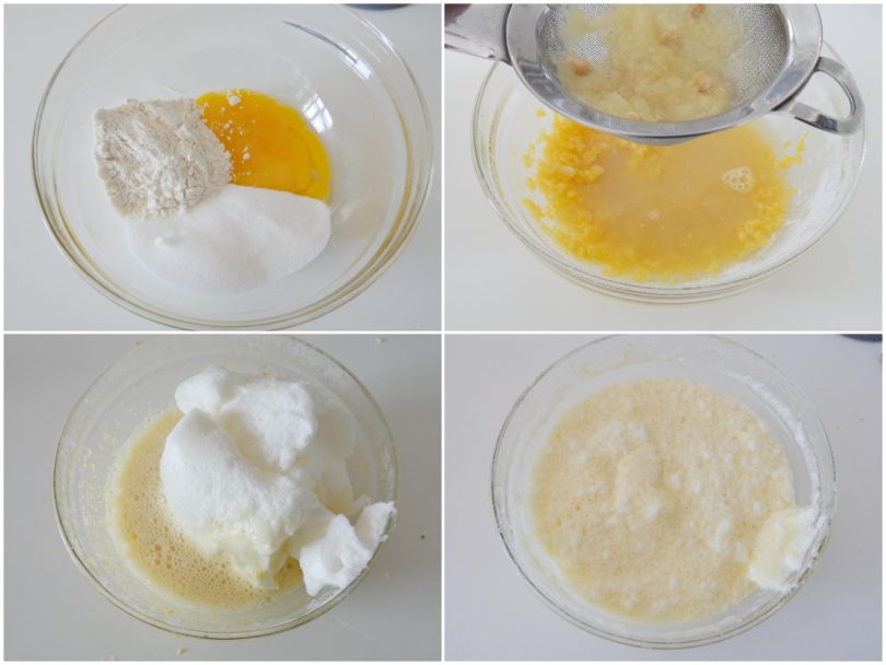 A parte, lavorate i tuorli con zucchero e farina, quindi aggiungete il succo di limone filtrato.