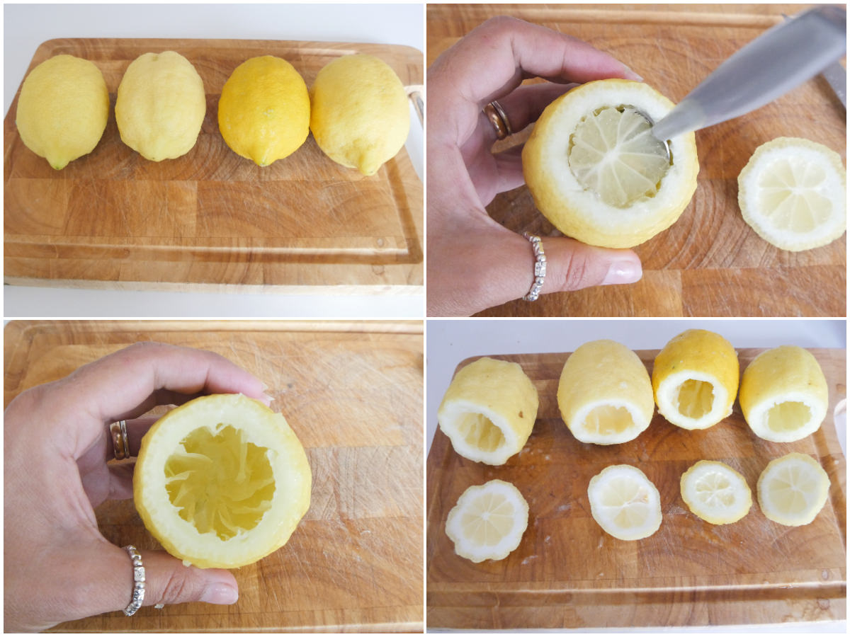 Innanzitutto lavate bene i limoni sotto acqua corrente, quindi tagliate via la calotta e scavate via la polpa (che metterete da parte per ricavarne il succo) con un cucchiaino, lasciando un guscio di almeno 1 cm di spessore.
