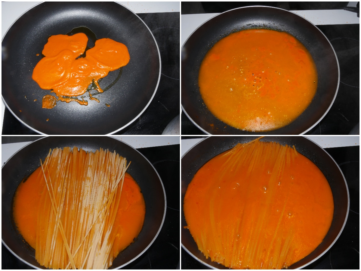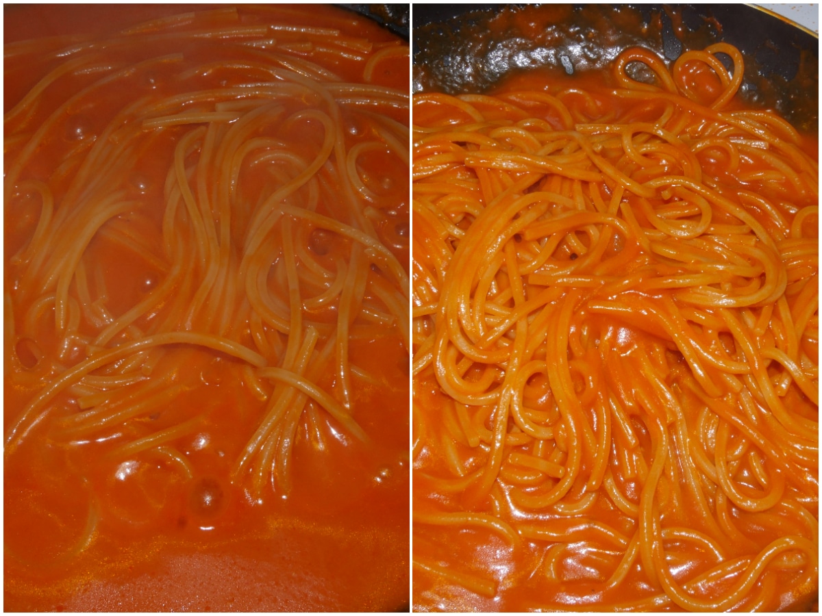 La differenza sostanziale consiste proprio nel sugo di pomodoro che, dopo la normale cottura, viene appunto emulsionato, ovvero si frulla per fargli inglobare aria, emulsionare olio e pomodoro e renderlo simile a una vellutata. Per rendere il tutto ancora più cremoso e far insaporire ancora di più gli spaghetti, la pasta viene risottata, ovvero cotta direttamente nel condimento, una cosa spaziale :D