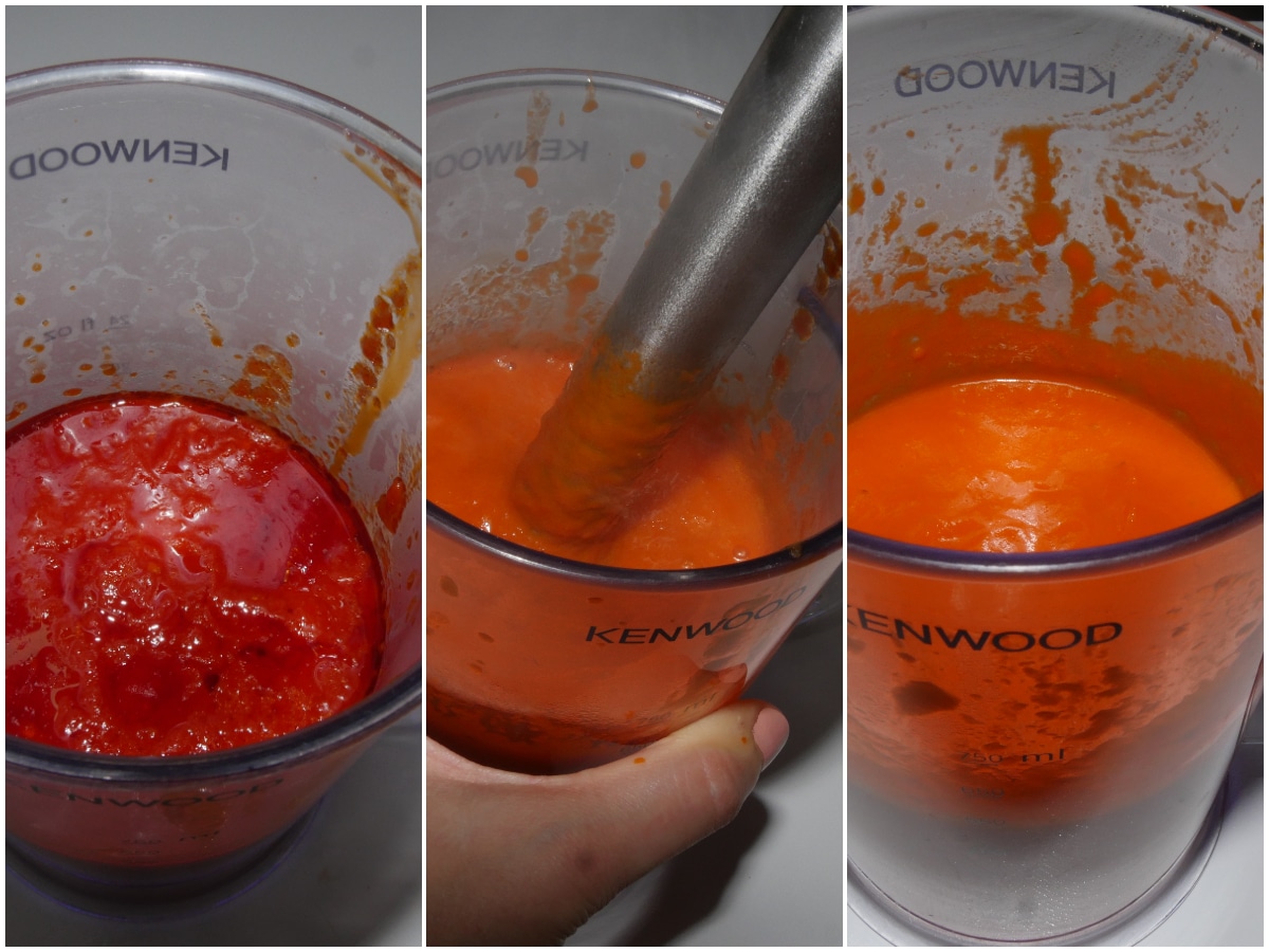 Trasferite il sugo nel bicchiere del minipimer e frullate, alzando e abbassando il frullatore a immersione in modo da inglobare aria. Come vedrete, il colore del pomodoro da rosso, diventerà bello arancione.