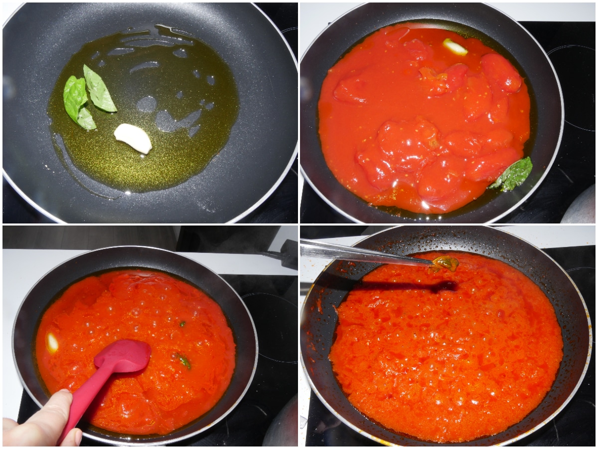 Innanzitutto fate dorare aglio e basilico con l'olio in una padella antiaderente molto ampia, aggiungete i pomodori pelati e schiacciateli con i rebbi di una forchetta. Condite con un pizzico di sale, fate cuocere per circa 15 minuti con un coperchio, poi eliminate aglio e basilico.