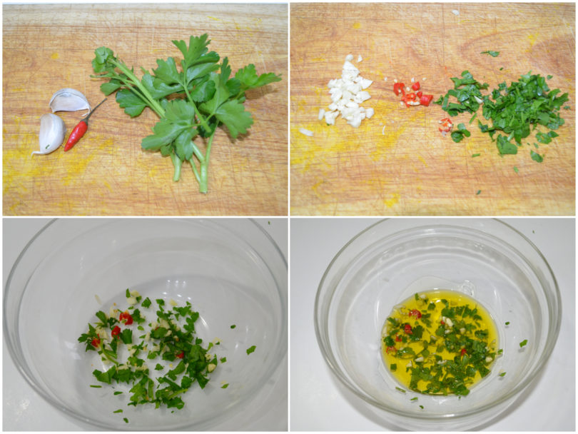 Pulite aglio, prezzemolo e peperoncino e tritateli, quindi metteteli in una ciotola capiente con olio abbondante e un po' di sale.