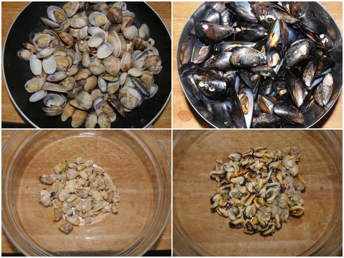 Innanzitutto lasciate spurgare cozze e vongole in acqua fresca per almeno 30 minuti, scuotendole ogni tanto, in modo da far uscire tutta la sabbia, quindi sciacquatele e pulitele sotto acqua corrente, strofinandole tra di loro a 2 a 2 o 1 per volta con una retina, in modo da togliere le impurità esterne.