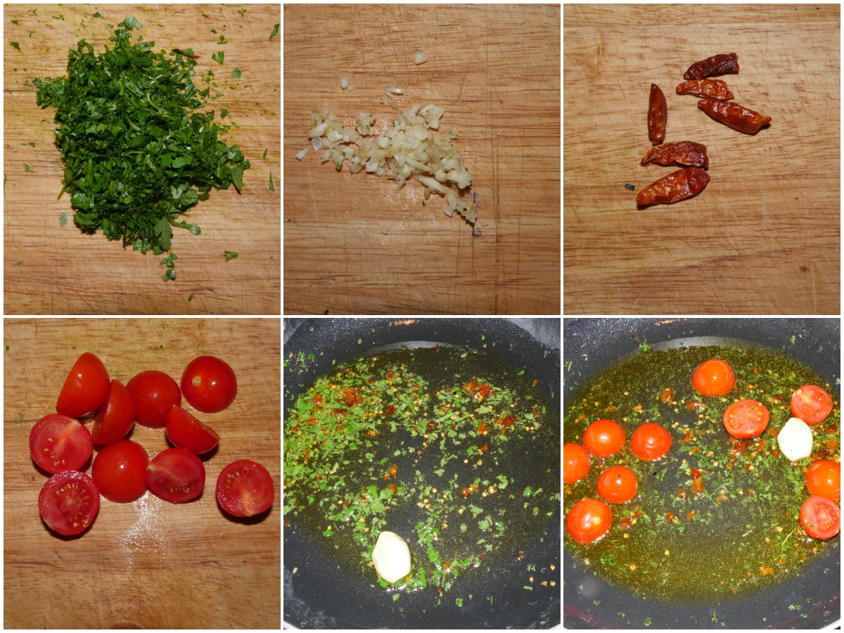 Preparate gli altri ingredienti: tritate prezzemolo e 1 spicchio di aglio, sminuzzate il peperoncino, lavate e tagliate a metà o in 4 parti i pomodorini.