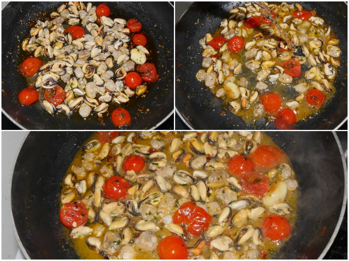 Aggiungete anche i molluschi con la loro acqua di cottura filtrata e lasciate insaporire per qualche minuto, aggiustando di sale se serve.