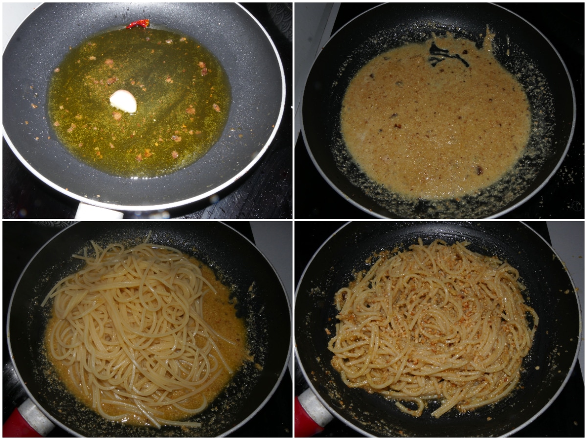 Preparate un soffritto con aglio, olio, peperoncino e acciuga sminuzzata, quindi aggiungete 3/4 delle nocciole e fatele tostare nel condimento.