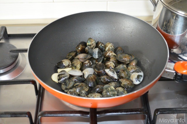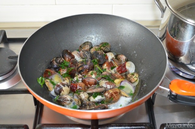 Coprire e lasciale aprire a fuoco alto, non appena aperte, sfumare con il vino bianco e aggiungere il prezzemolo tritato e il peperoncino