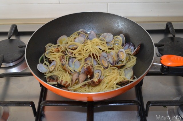 Scolare gli spaghetti a meta cottura e, metteli nella padella con le vongole insieme ad un mestolo di acqua di cottura e far saltare in padella giusto per far insaporire il tutto.