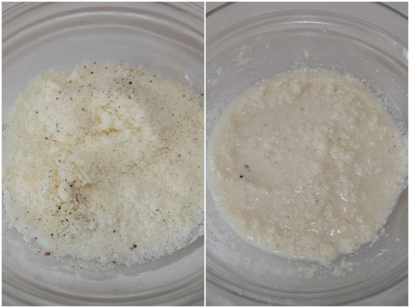 Create una cremina con 100 g dell'acqua di cottura della pasta, il pecorino e pepe a piacere.