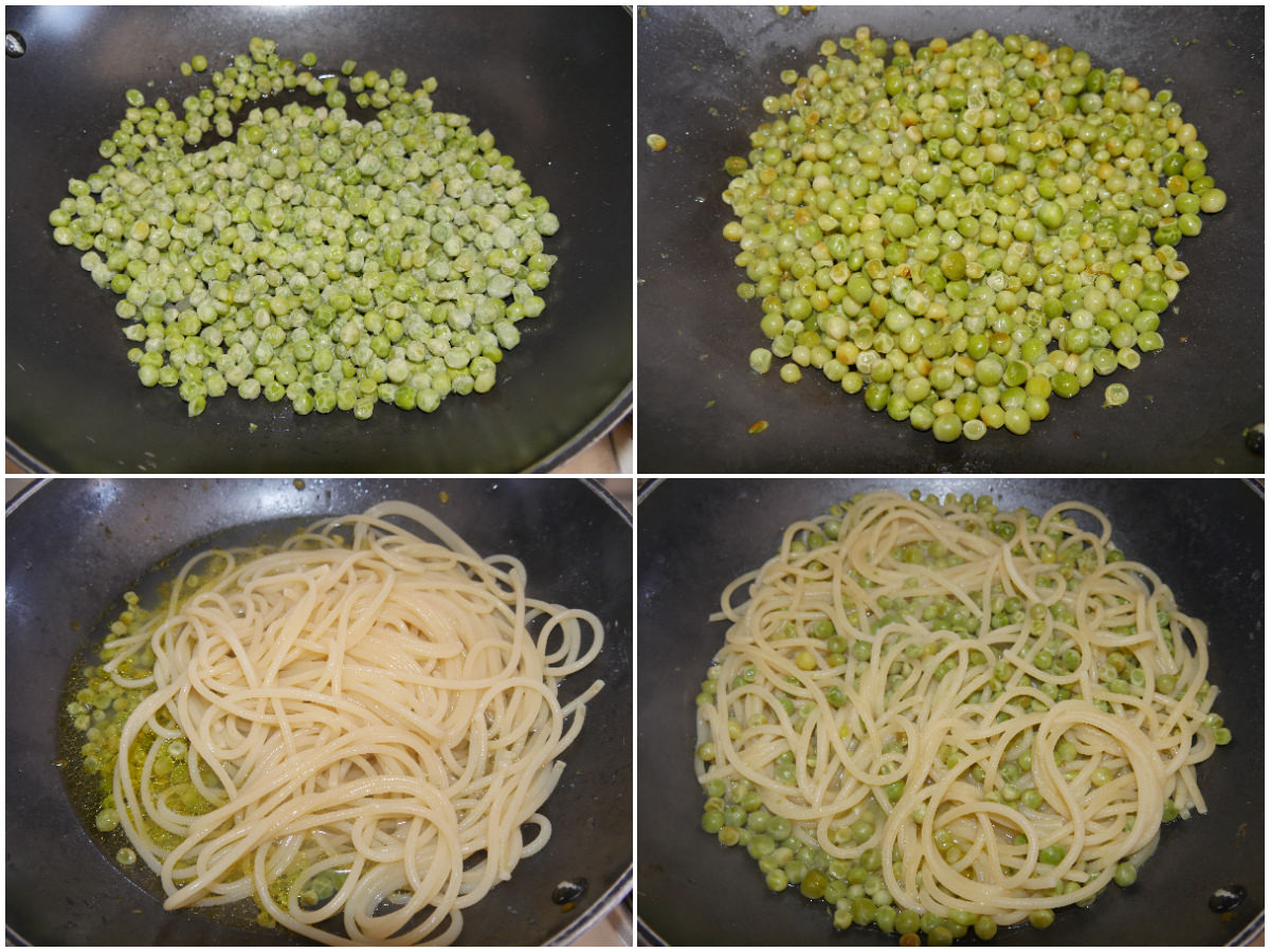 Innanzitutto sbollentate i piselli per 2-3 minuti in acqua bollente, quindi scolateli e ripassateli velocemente in padella con sale e olio.