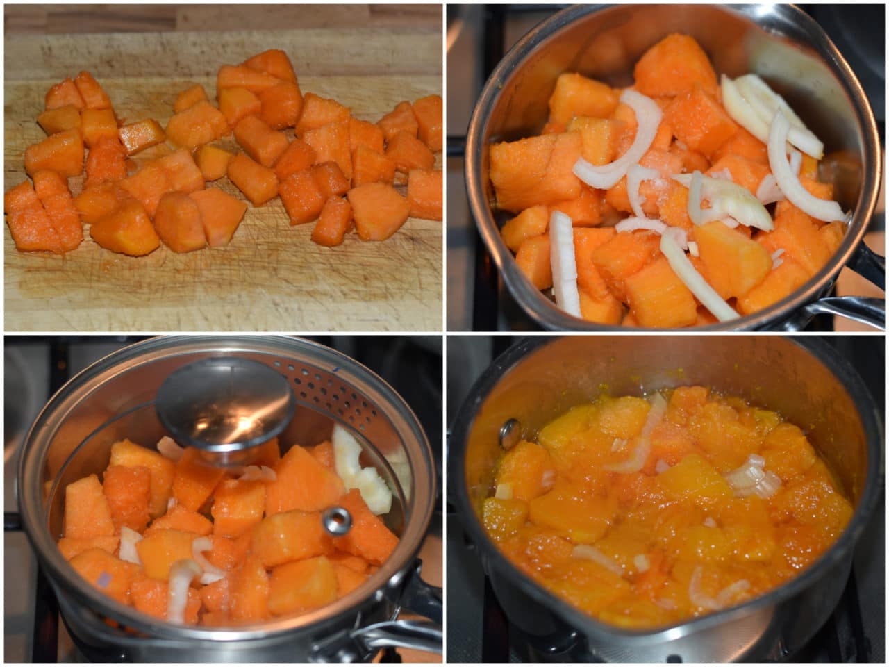 Nel frattempo mondate zucca e cipolla, tagliate la prima a pezzi e la seconda a fette, mettete tutto in una pentola con 1 bicchiere d'acqua e stufate a fiamma bassa, con coperchio, per circa 20 minuti o finché la zucca non si sarà ammorbidita.