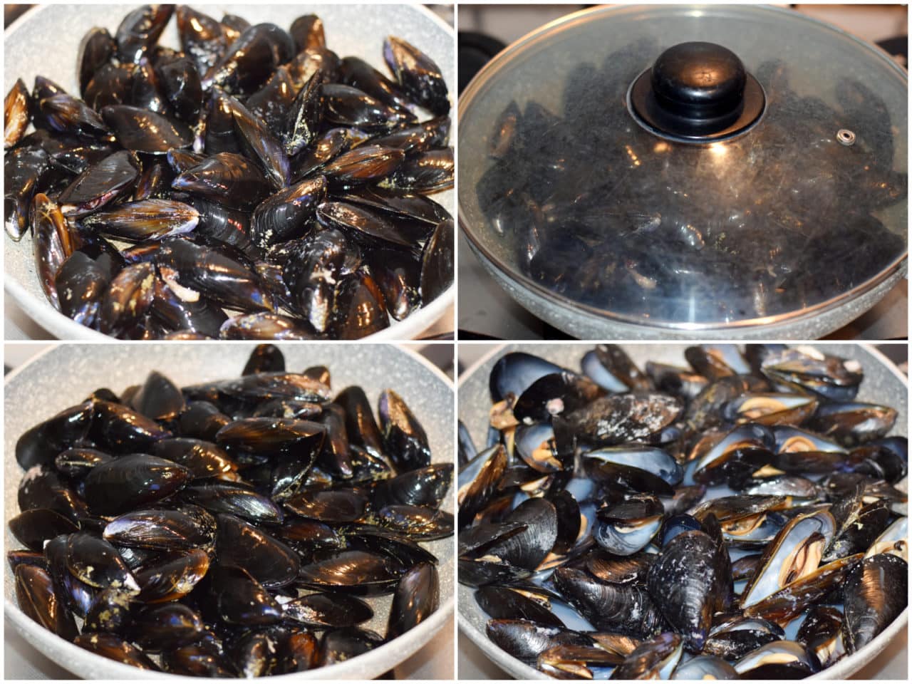 Scolate le cozze, mettetele in una casseruola, chiudete con coperchio e cuocete a fiamma medio-bassa finché non si saranno aperte tutte (eliminate quelle eventualmente rimaste chiuse).